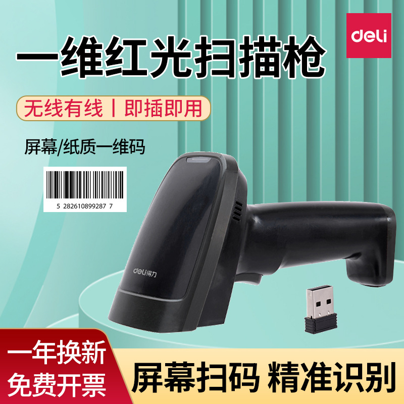 得力14882W无线扫码枪一维码红光扫描枪商品条码快递单手持扫码器