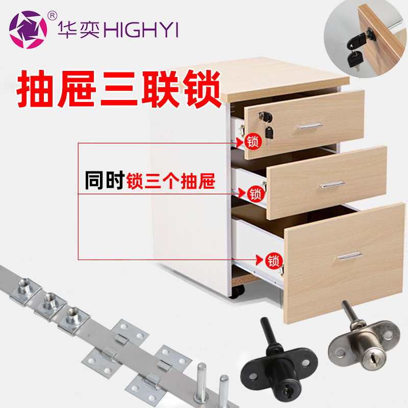 正面側面デスク三連引き出しロックファイルキャビネットロック多引き出しロックブリキキャビネット連動三連ロック