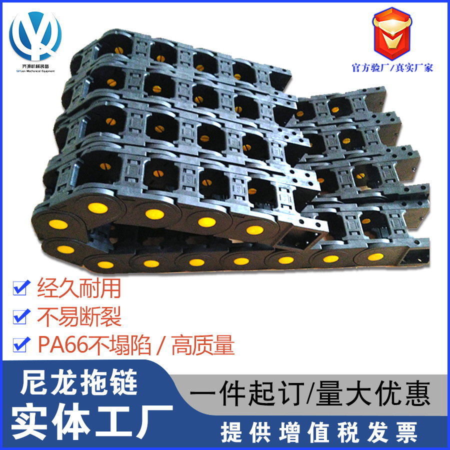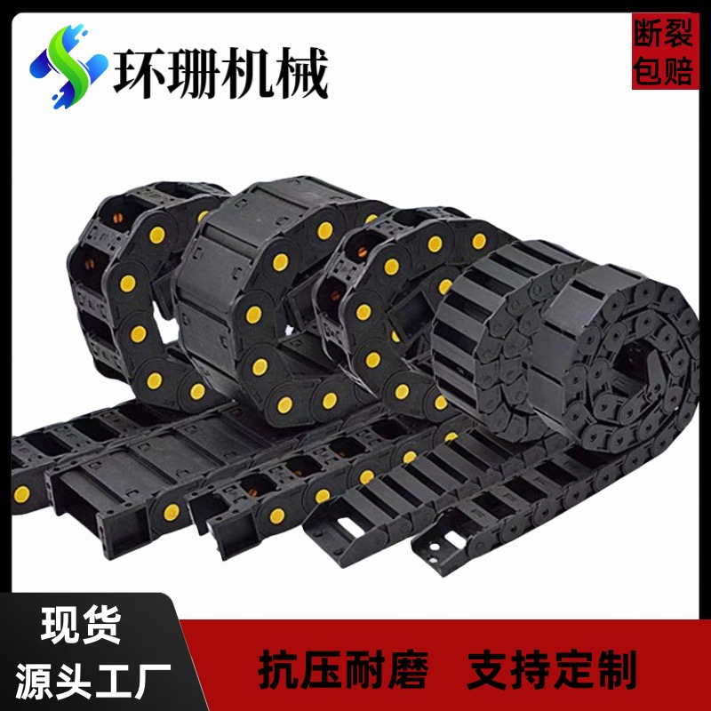 本公司生产多种规格拖链支持定制。公司生产拖链适用于:数控机床 雕刻机 开料机 加工中心 侧孔机 数控加工中心 激光切割机 光纤切割机等数控机床,本产品采用尼龙材质耐高温达到150° 拖链采用卡扣设计使得运行过程流畅静音,支撑力强 大型机床使用不会出现塌陷情况,深得行业内大型工厂信赖!
