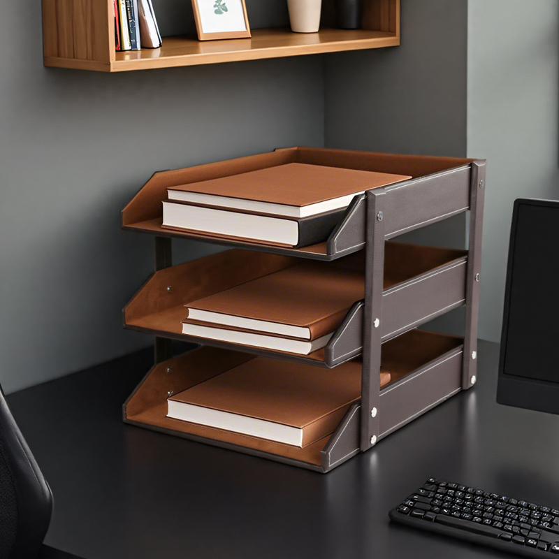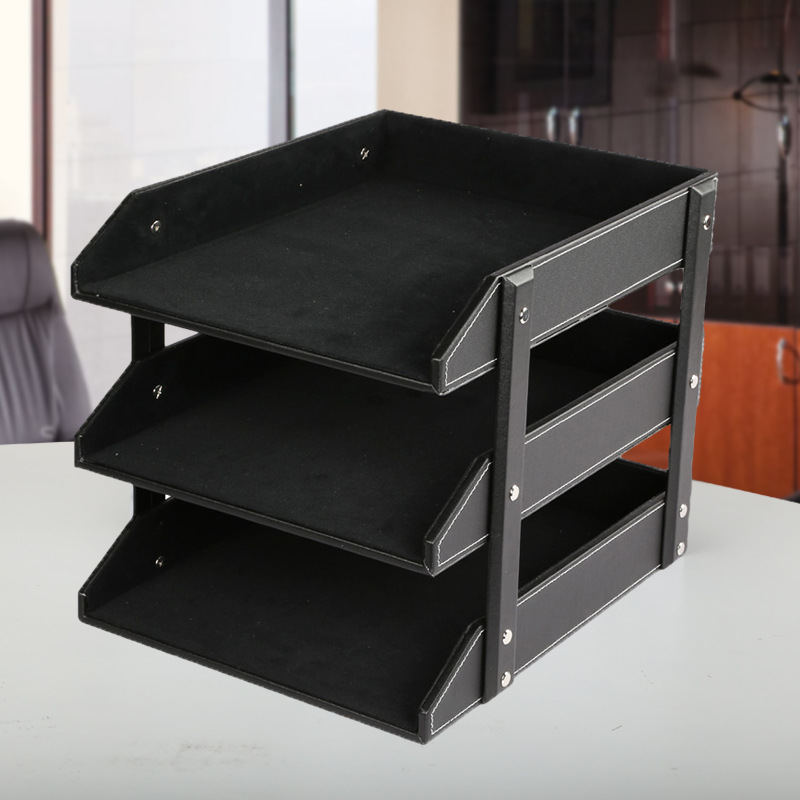 皮革三层文件架资料收纳架桌上文具用品办公室写字楼摆件文件框