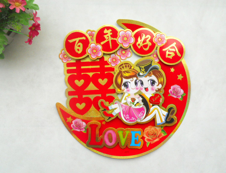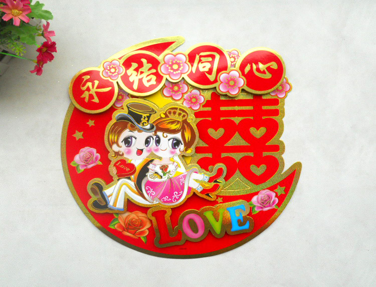 Love喜字貼永結同心百年好合月亮船漫画夫婦立体門貼壁貼1対装
