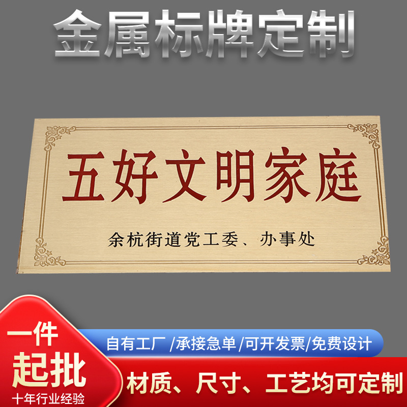 | 铝标牌(Aluminum plate)是众多标牌中的一种铝制标牌,通常采用铝板冲压、切割、凹凸和铝合金压铸加工成型。常见工艺:高光(磨光)、腐刻、氧化、拉丝,激光雕刻、电镀、喷涂、点漆、珐琅、烤漆,反光、夜光印刷等工艺制作。表面内容颜色采用:丝网印刷、四色胶印、热转印来完成色彩效果,可印制各种文字、编号、图案等内容。 |