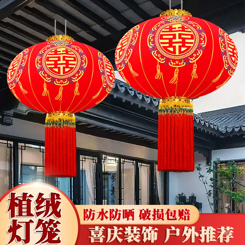 新款植绒结婚大红灯笼喜字喜庆婚房挂饰防水阳台大门元旦新年春节