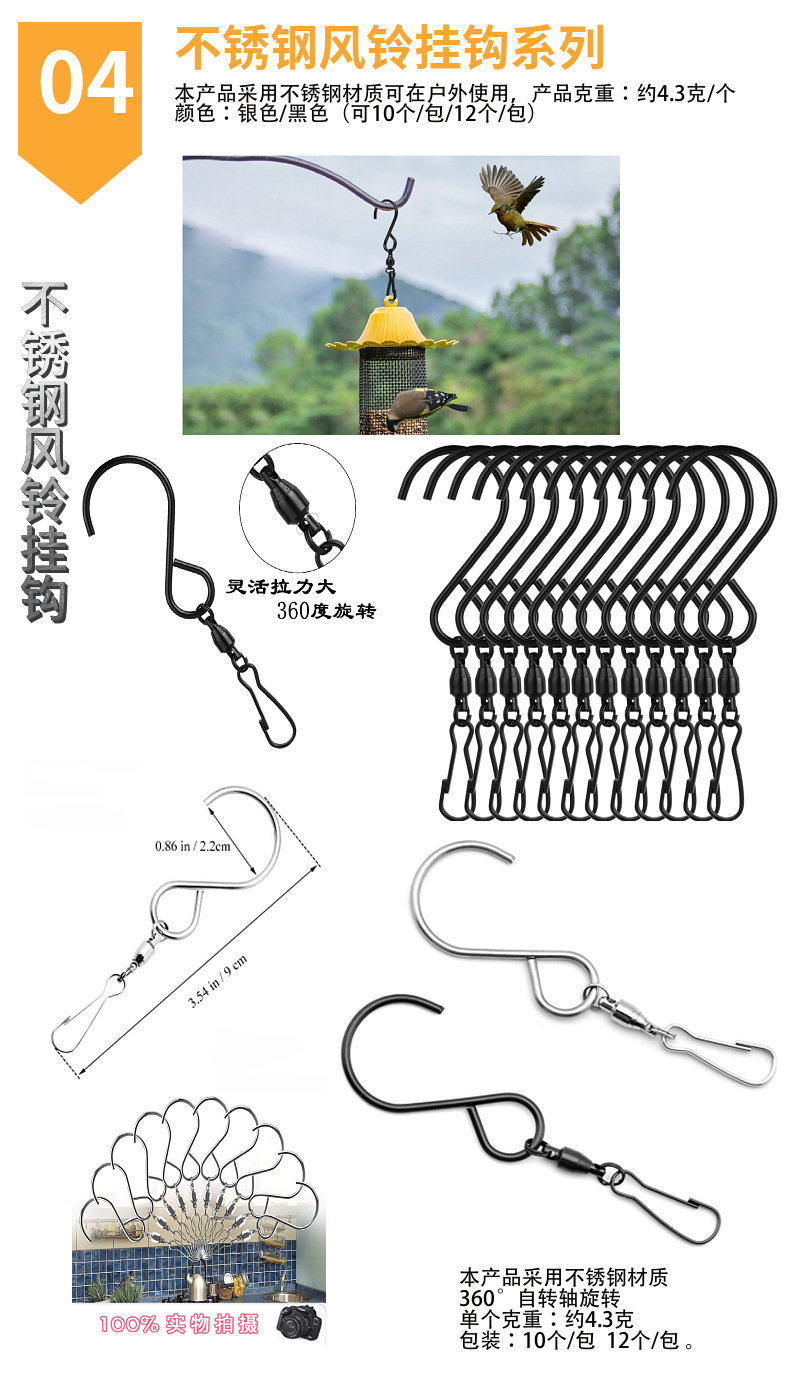 クロスボーダー人気ステンレス360 ° 回転風鈴フック屋外風鈴ストラップ部品錆びず長持ち