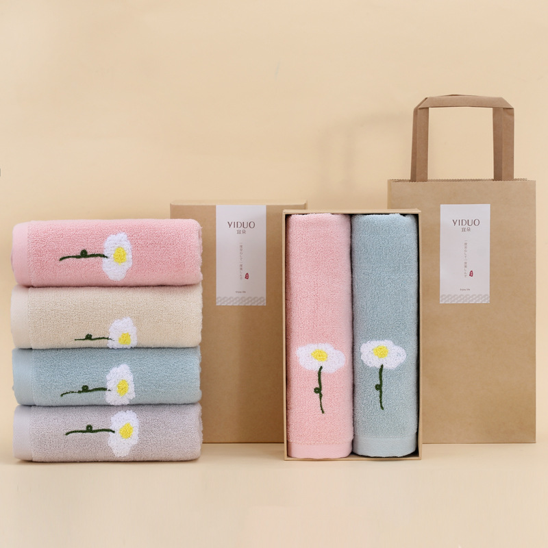 純綿無地刺繍花柄吸水タオル 大人用 柔らか厚手綿100%洗顔タオル 記念品 毛羽立ちなし