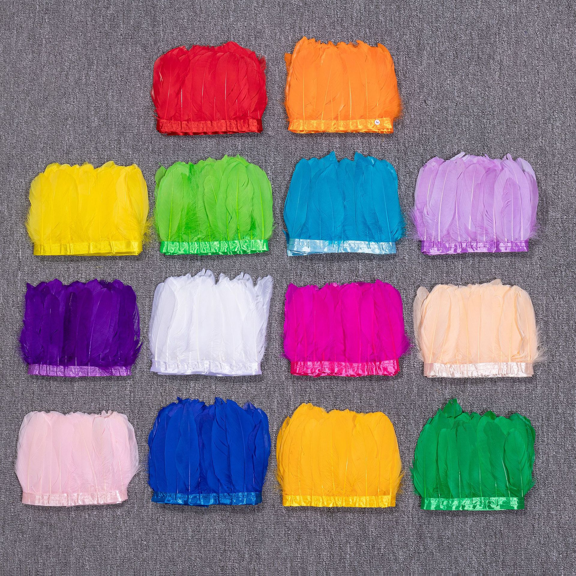 カラフルな硬質羽根布縁飾り、グースフェザー布ストリップ、DIY羽根飾り、舞台衣装、ショール、羽根装飾