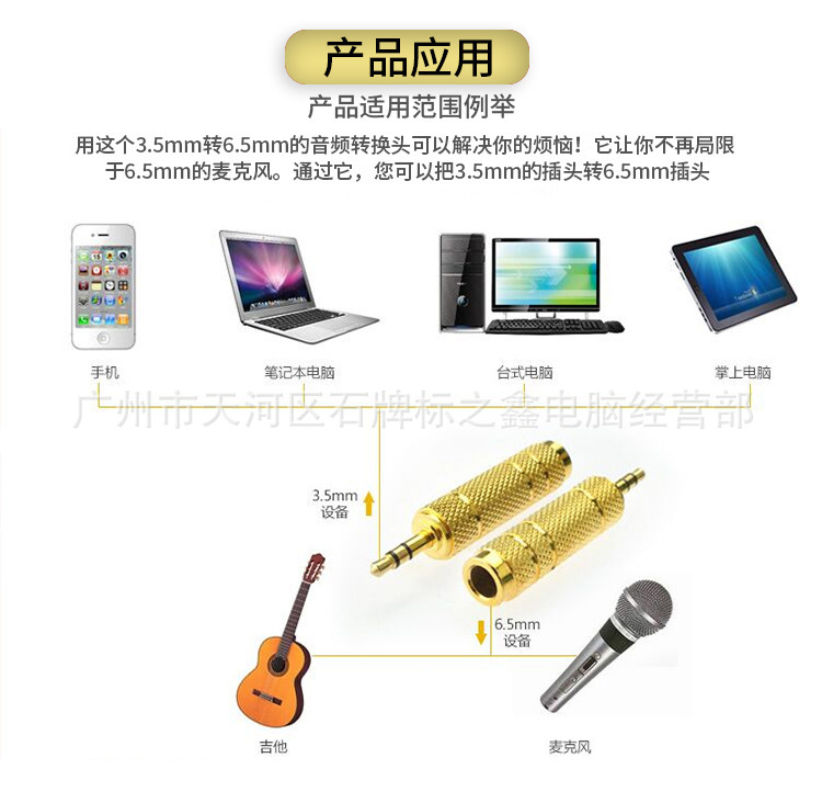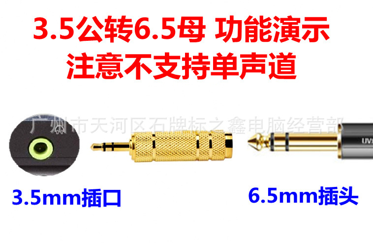 主要用于6.5mm规格的电吉他、电子鼓、MIC话筒等转接到电脑及其他3.5mm规格的设备。同时也可以将电脑、MP3、手机等设备的音频信号转换到6.5mm接口的设备使用