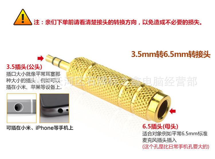 【使用方法】将6.5mm标准麦克风或其他6.5mm插头插入转换头的6.5mm母口,将3.5mm公头插入手机、电脑等具有3.5mm插口的输出设备