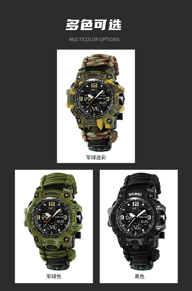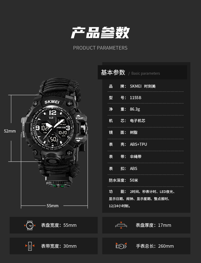 功能:双时间、秒表计时、显示日期、定时响闹、显示星期、夜光、12/24小时制。