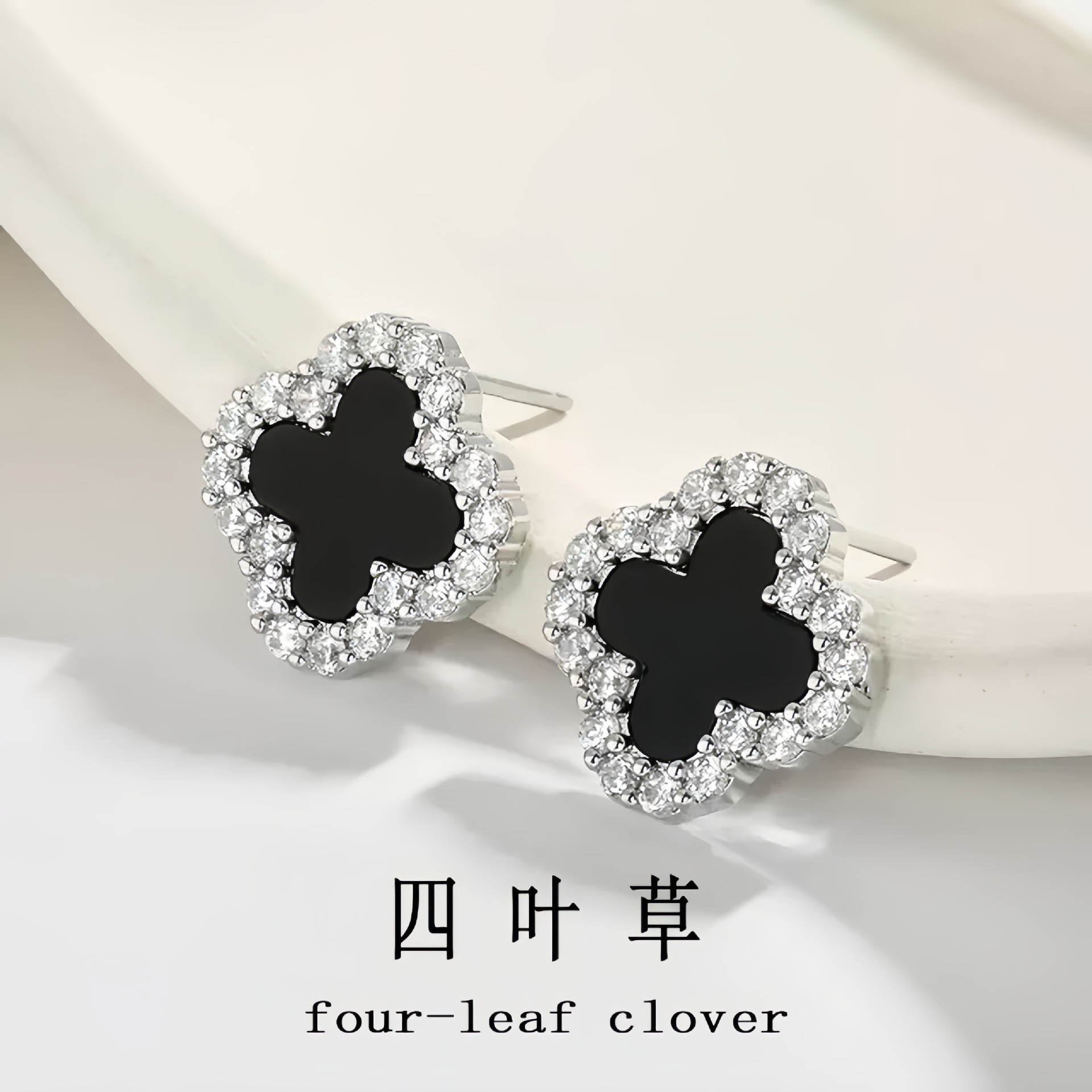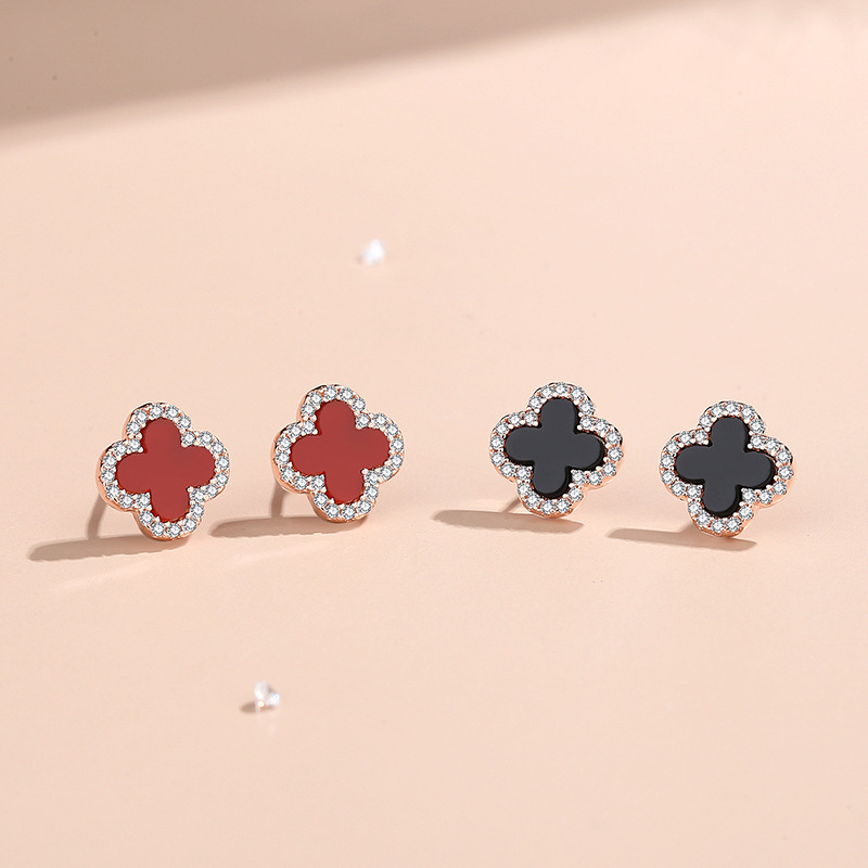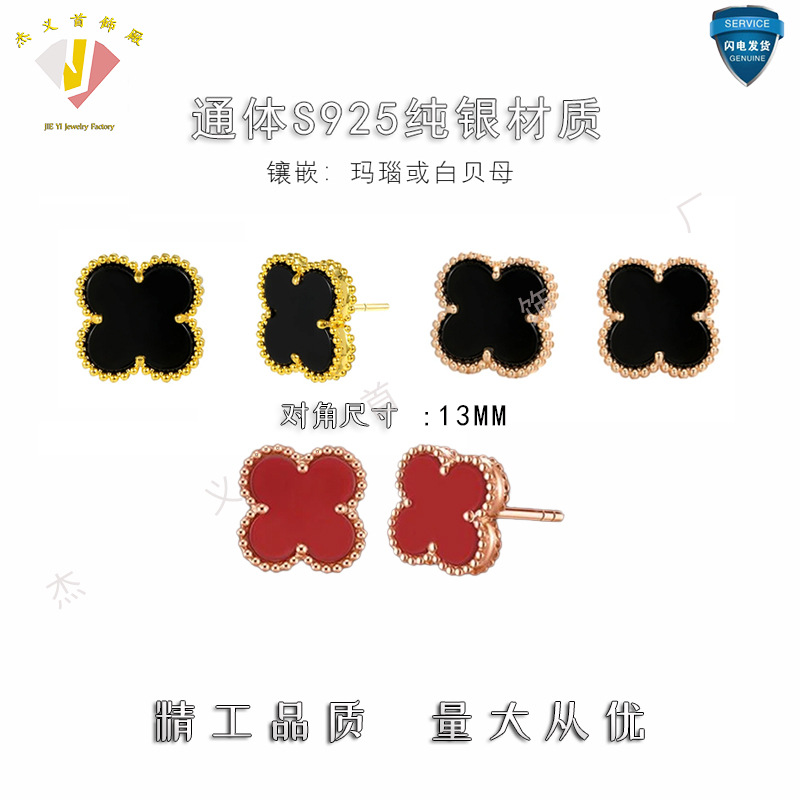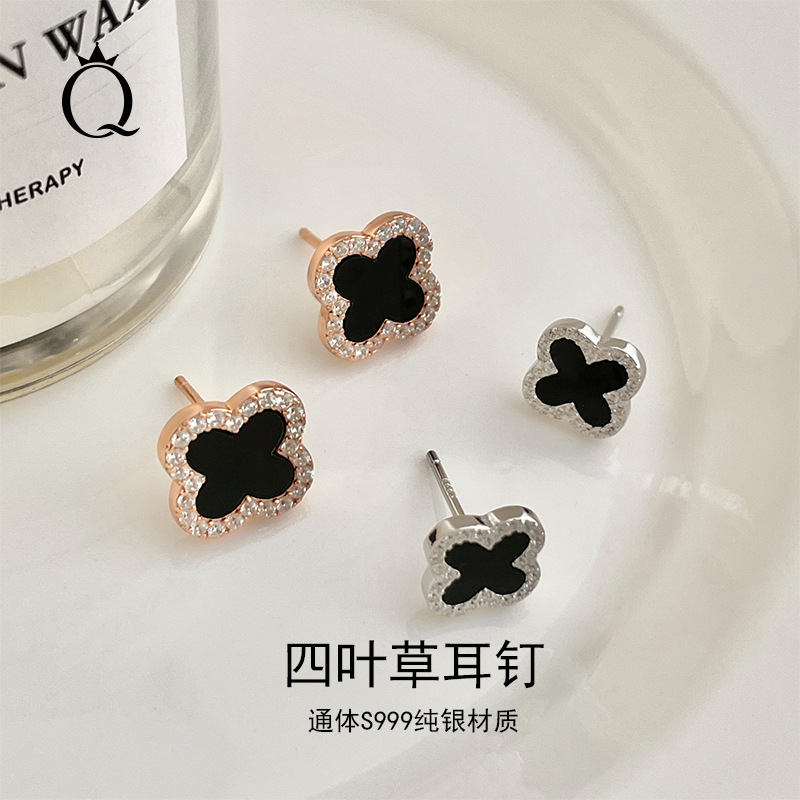 S925纯银黑玛瑙四叶草耳钉女韩版气质时尚百搭高级甜美幸运草耳坠