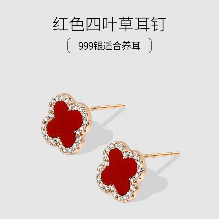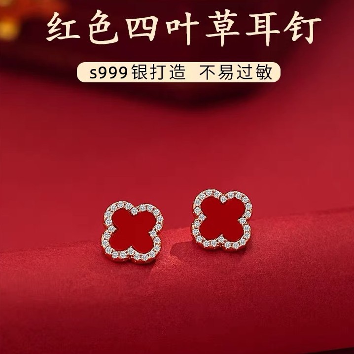 S999純銀四葉草ピアス日韓名媛風気質イヤリング高級感シンプルな赤いイヤリング卸売り