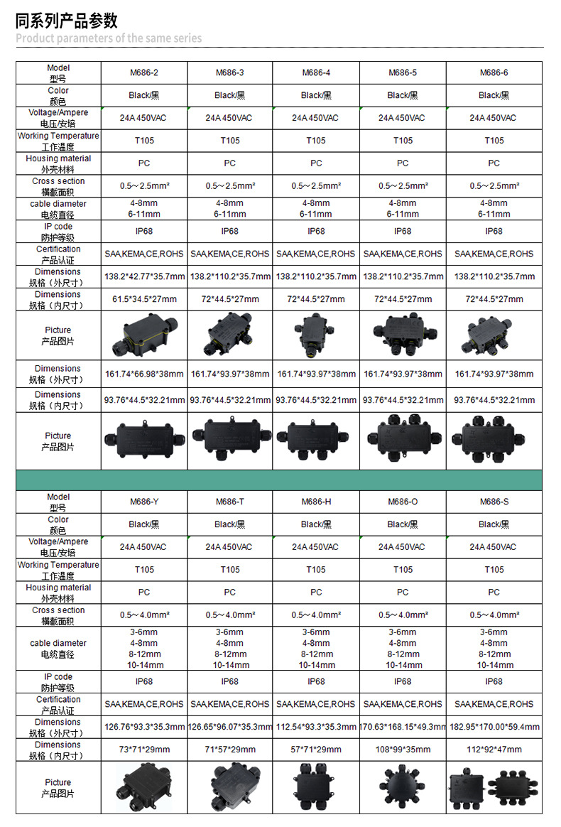 仕様とモデル 863--5 クイックコネクタ,M686-Y×線径4~8mm,M686-Y×線径8~12mm,M686-Y×10-14mm線径,M686-Y*4-8mm PA10-3Pネジ端子台付,M686-Y*8-12mm PA10-3Pネジ端子台付,M686-Y*10-14mm PA10-3Pネジ端子台付,M686-Y*4-8mm、863-5 クイック コネクタ付き,M686-Y*8-12mm 863-5 クイック コネクタ付き,M686-Y*10-14mm、863-5 クイック コネクタ付き,4-8mm、追加の8-12mm/10-14mmゴムコアPA10-3P銅端子台付き