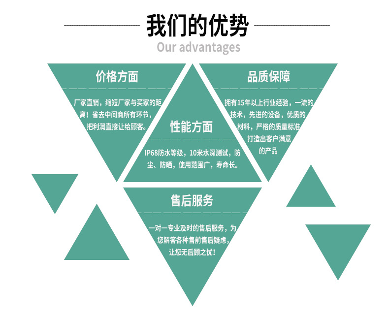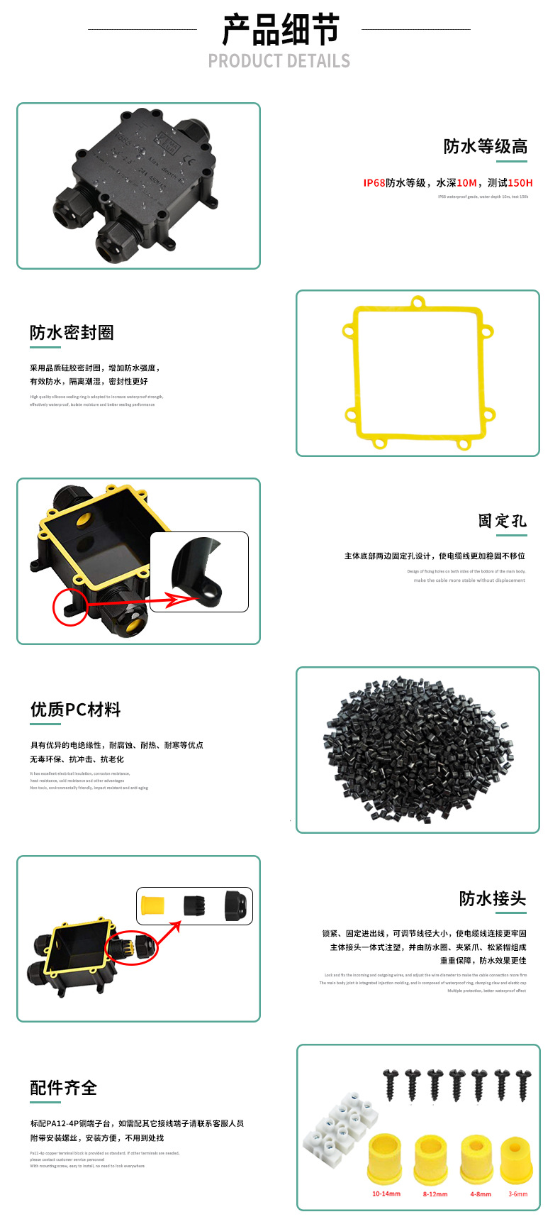 主营产品:防水接线盒、防水连接器、防雷器、路灯配电盒、电缆盒、连接器、接线端子、线上开关,脚踏开关