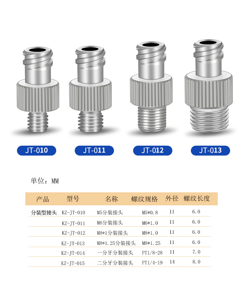仕様 JT-010 m 5分注継ぎ手,JT-011 m 6分注継ぎ手,JT-012 m 8*1分注継ぎ手,JT-013 m 8*1.25分注継ぎ手,JT-014一分歯分注ジョイント,JT-015二分歯分割継手