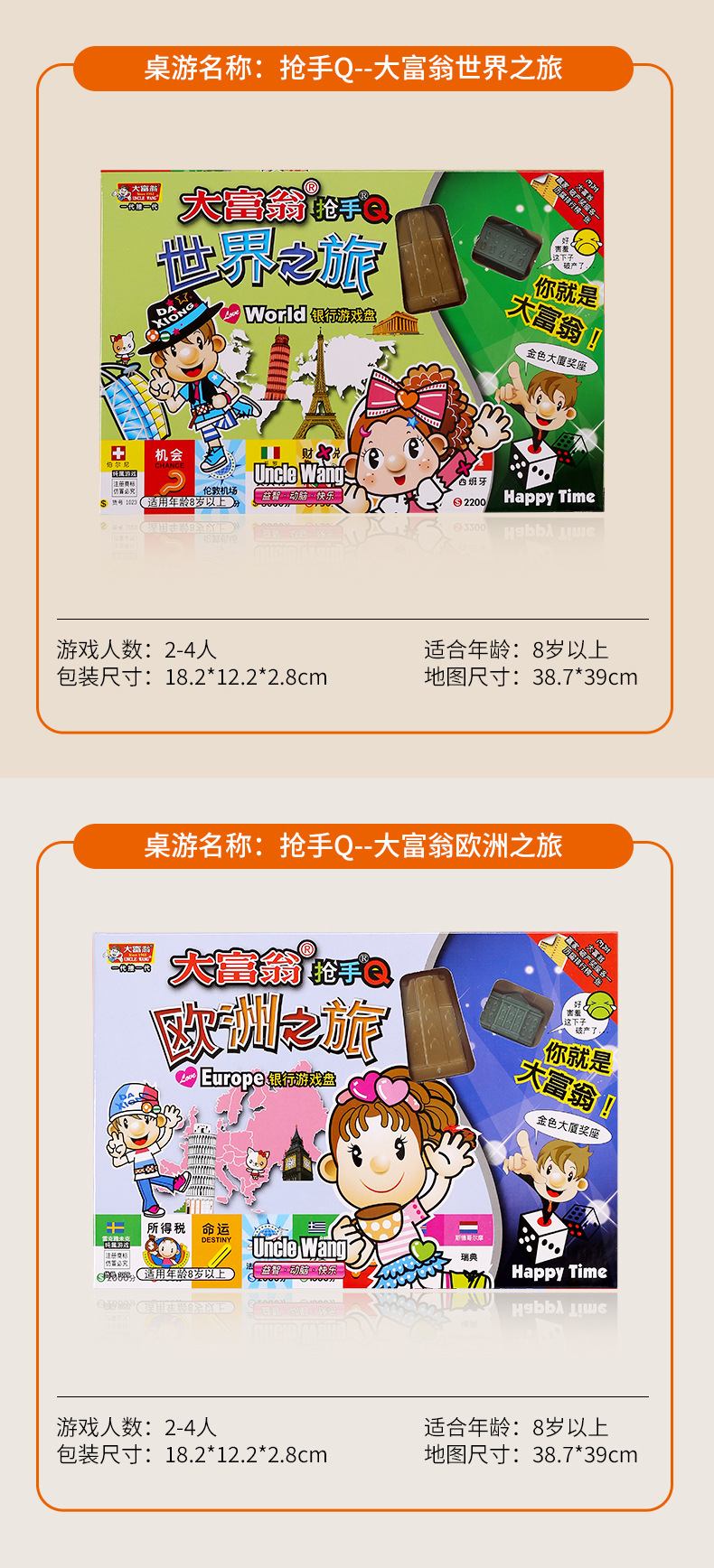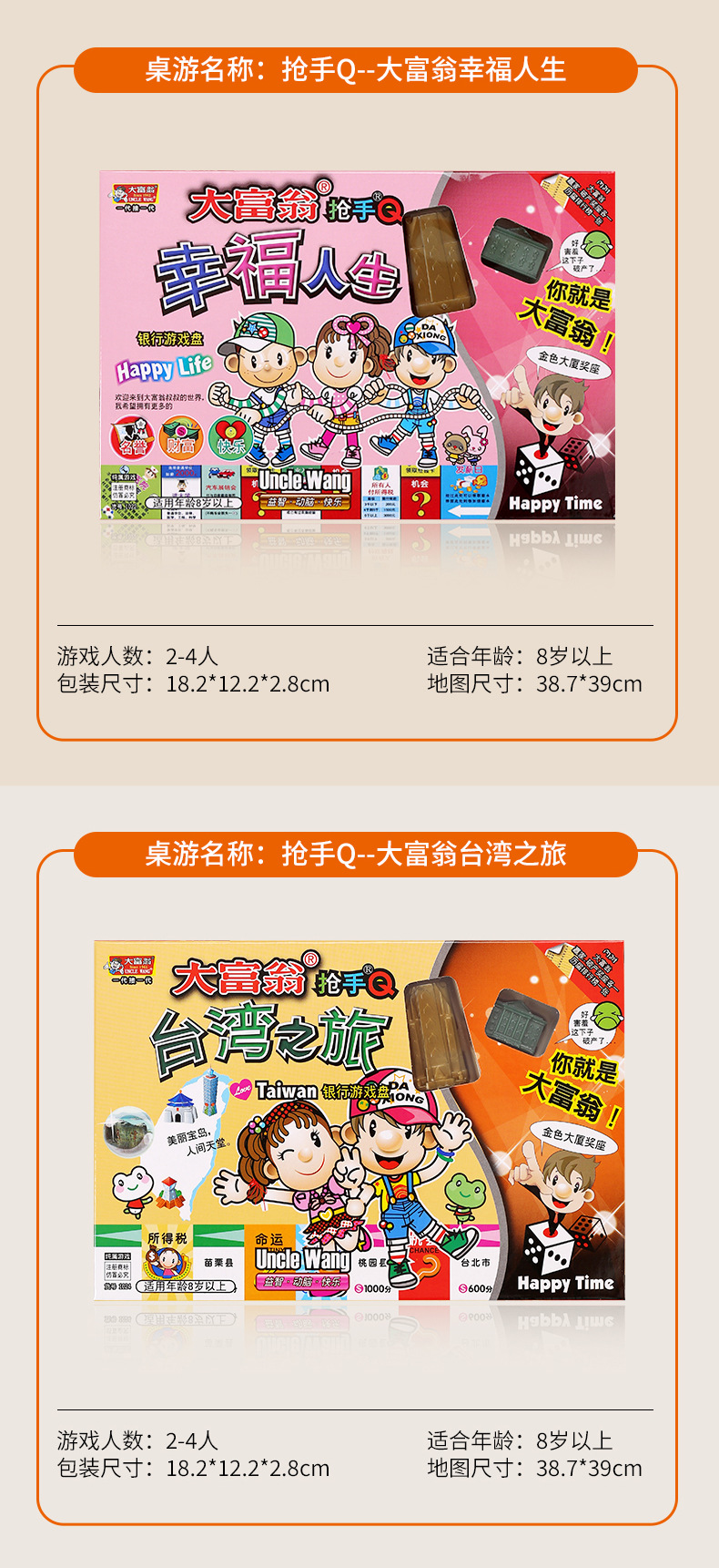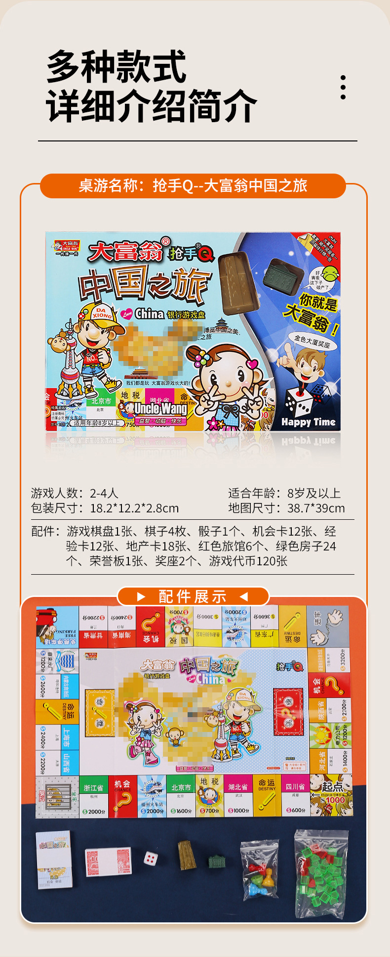 1022幸せな人生,1023世界の旅,1024台湾ツアー,1025中国の旅,1026ヨーロッパツアー,1027アフリカの旅,1028アメリカツアー,1061魅力四川省,1062水郷江南,1063情熱山東,1064内モンゴルの旅,1065新疆の旅,1067雲貴の旅,1066東北の旅,Qバージョン1002 ハッピーライフ,Q版1003 世界旅行(新パッケージ),Q版1004 台湾旅行,Q版1005 中国旅行,1006 チェッカー,1007 フライングチェス,1008 ビーストチェス,1009 ジグソーパズル,モノポリー S 101 ヨーロッパ旅行,モノポリー S 102 ワールドツアー,モノポリー S 103 中国旅行,モノポリー S 105 広東旅行,モノポリー S 106 上海旅行,モノポリー S 107 北京旅行,モノポリー S 108 香港旅行,シルバー 3001 上海ビーチ,シルバー3002 幸福な人生,シルバー3004 世界旅行,銀牌3005 台湾旅行,銀牌3007 中国旅行,シルバー 3013 ハッピーライフ プロフェッショナル エディション,ブロンズ-5301 上海ビーチ,ブロンズ - 5302 幸せな人生,ブロンズ - 5304 世界旅行,ブロンズ - 5305 台湾旅行,ブロンズ - 5307 中国旅行