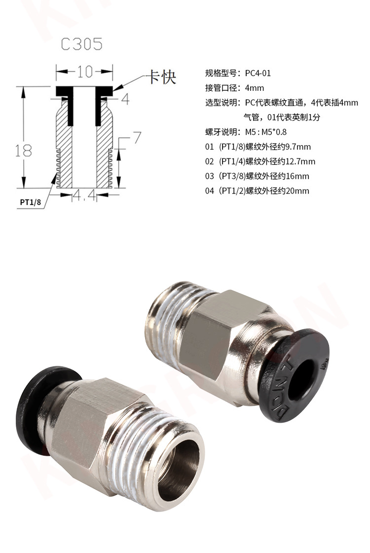気動銅快速継手PC8-02ねじ直通PC4-M5気管ワンタッチ継手6-01/10-03