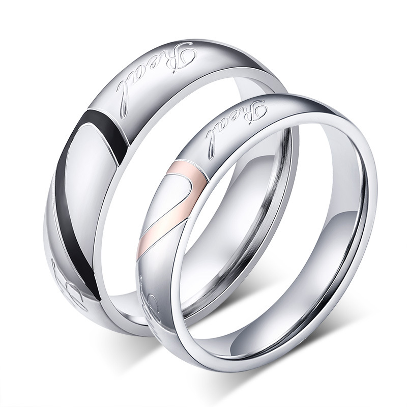 欧米の新型韓国版チタン鋼愛カップルペアリング半桃心グラデーション黒バラ金カップルペアリングメーカー