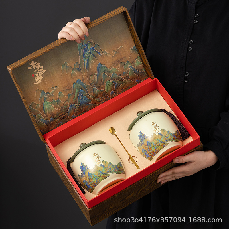 新品千里江山陶瓷茶叶罐礼盒红茶茶饼绿茶包装密封储存罐茶叶罐
