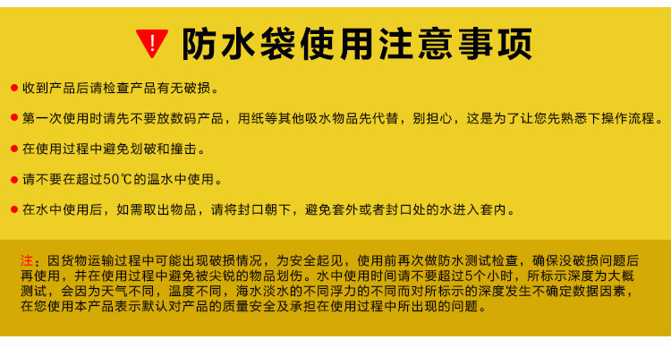 亲,为了打消您对防水袋会进水的顾虑,收到货以后把纸巾装进袋内,放水里泡一晚,第二天如出现进水,请直接联系我们处理。就是这么自信!