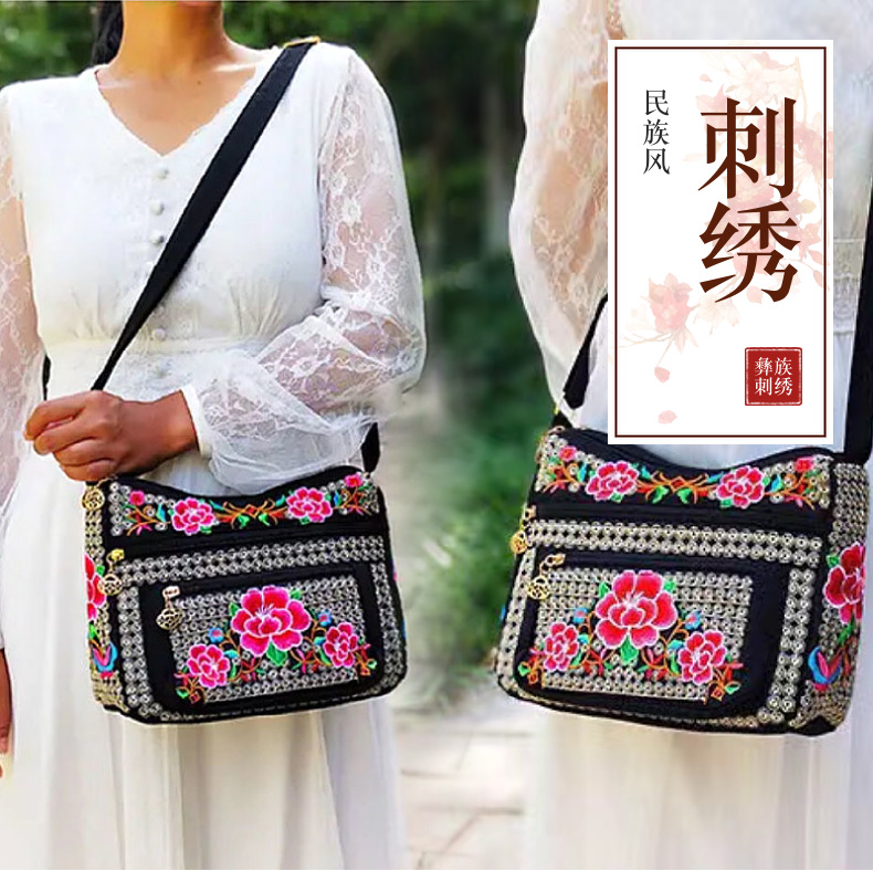 現物雲南民族風刺繍バッグ中高年女性シングル肩三層ファスナー刺繍斜め掛け携帯電話小銭入れ