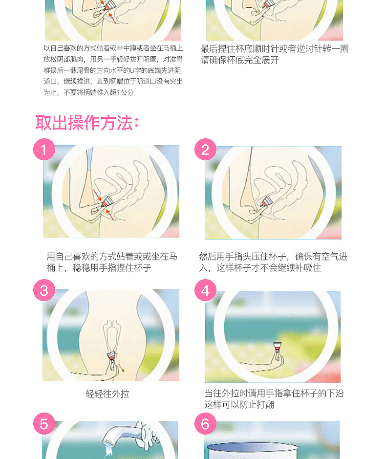 步骤4:选择一个自己的姿势坐着、蹲着或者站立着,使阴道内的肌肉放松,用手轻轻地分开阴唇,把月经杯顺着阴道的方向放入阴道内,确保放入后完全打开,然后要继续将月经杯往里推进直到完全的进入阴道内即可。