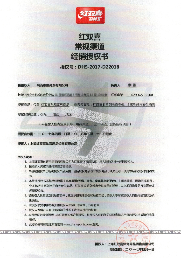 陕西春兰商贸有限公司,鑫龙体育专营店主营产品:红双喜、斯伯汀等知名运动品