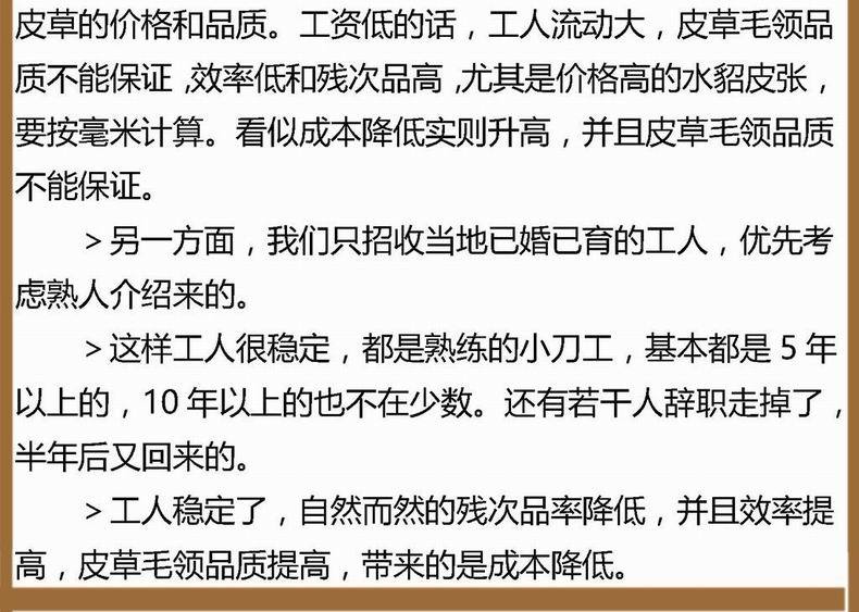 另外,兔皮成本是z-u-i低的,原因是养殖成本低,繁殖力强。但是兔毛领皮板薄,强力低。有时候客户需要毛领返工重新改尺寸。别的毛领可以改,兔毛领因为皮板薄,改的时候很慎重。