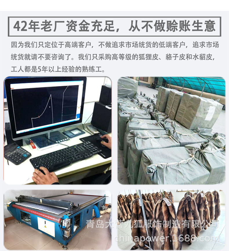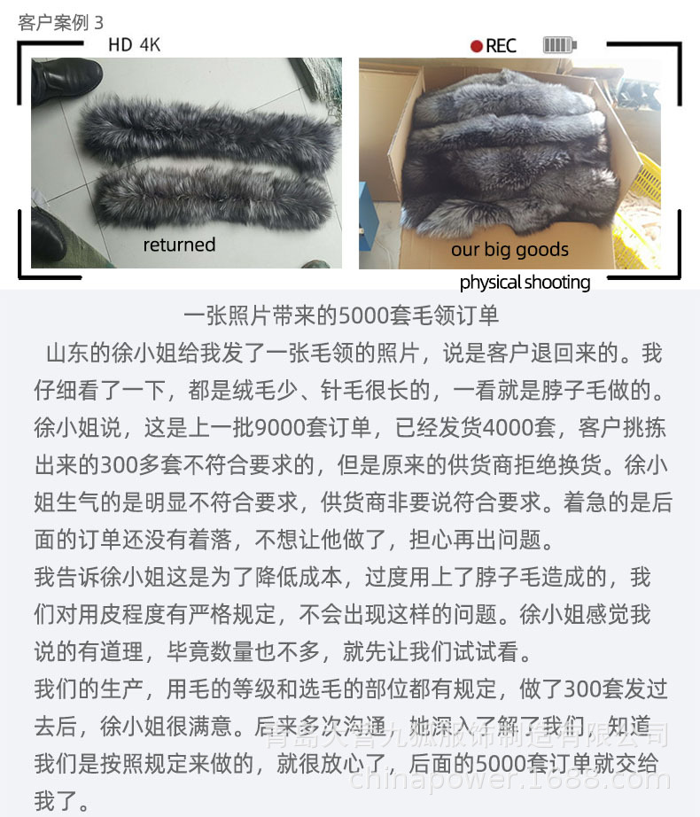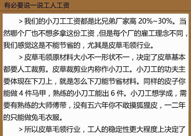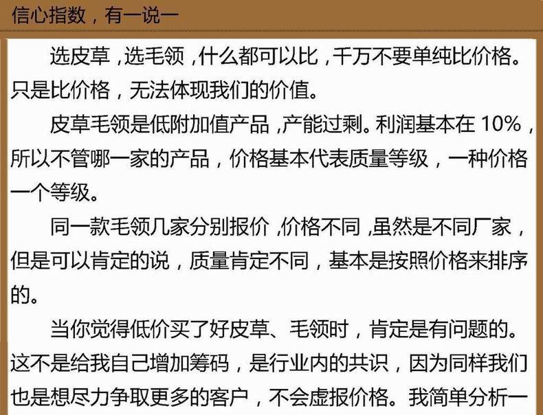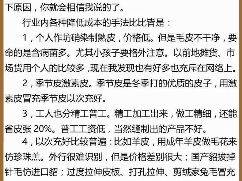 往往外行因为熟悉貉子毛领的这里面的道道,简单的认为貉子毛领都一样,只要按照尺寸来,谁家低就找谁家。这种想法一般100%都会中招。