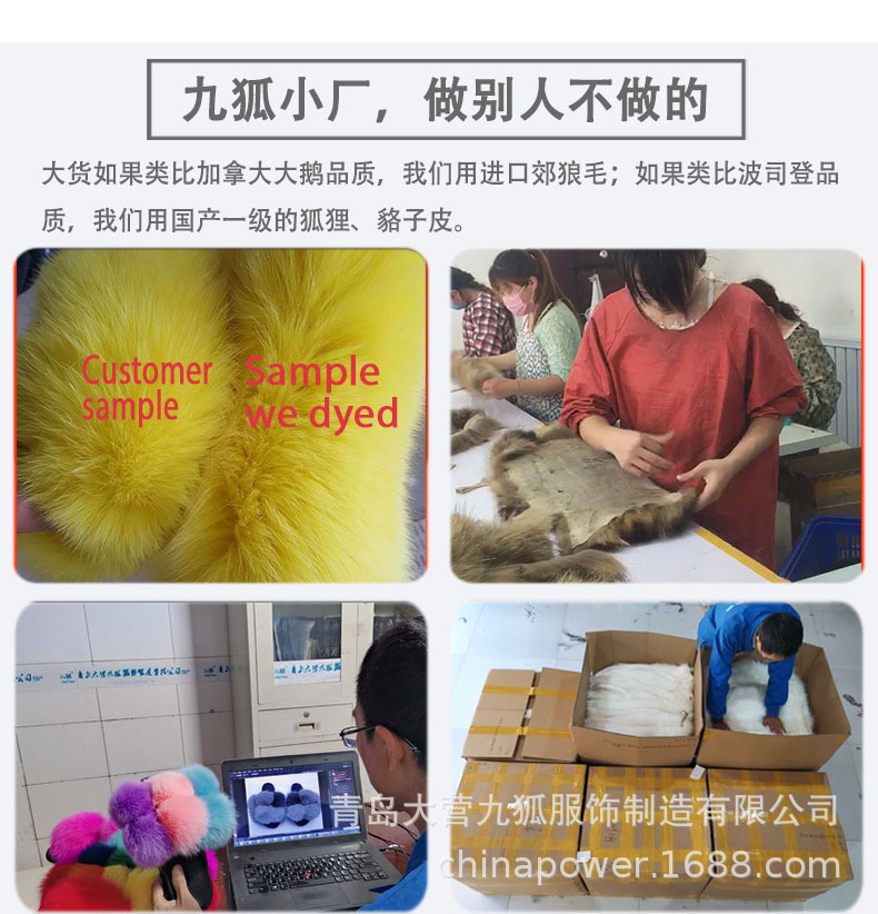 像我们毛领厂家都是用整张貉子皮割貉子毛领。这样的毛领接缝少掉毛少,因为是大块的貉子皮,所以毛面毛路统一,毛长、绒毛一致性好,大货的颜色、毛路变化区间小。是c-h-u口、p-i-n牌服装上用的品质。