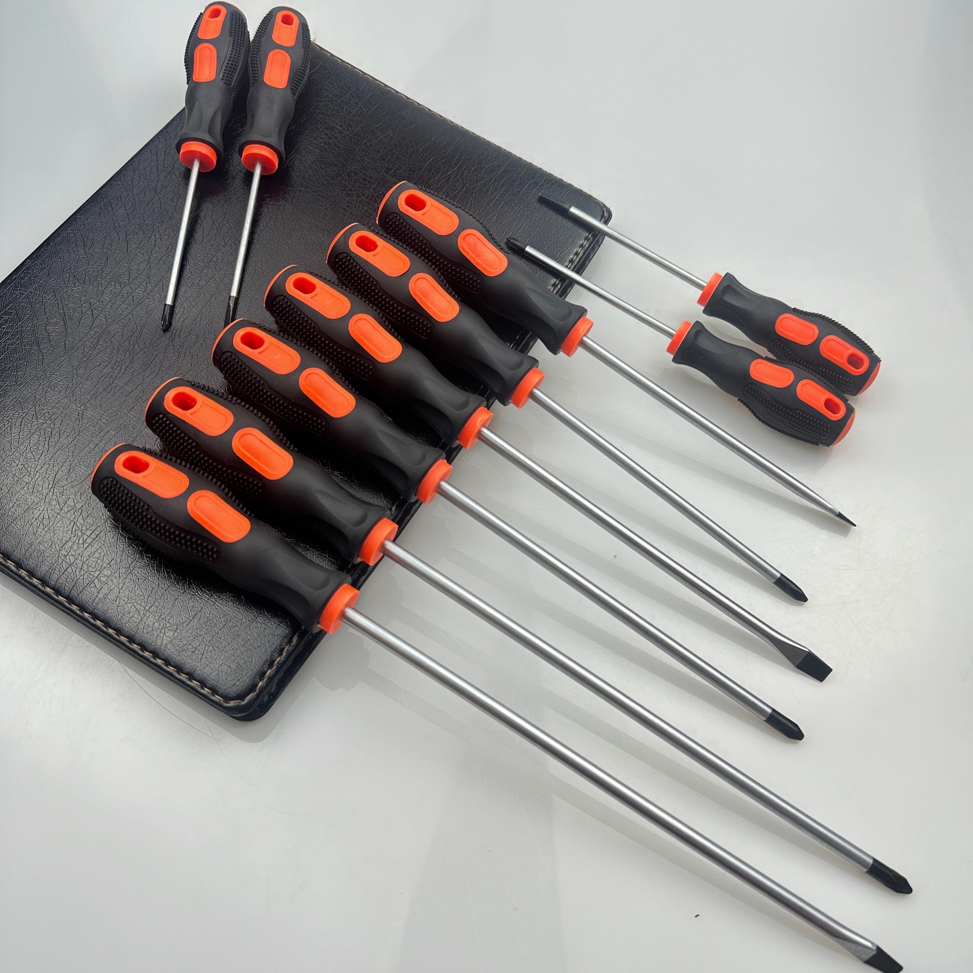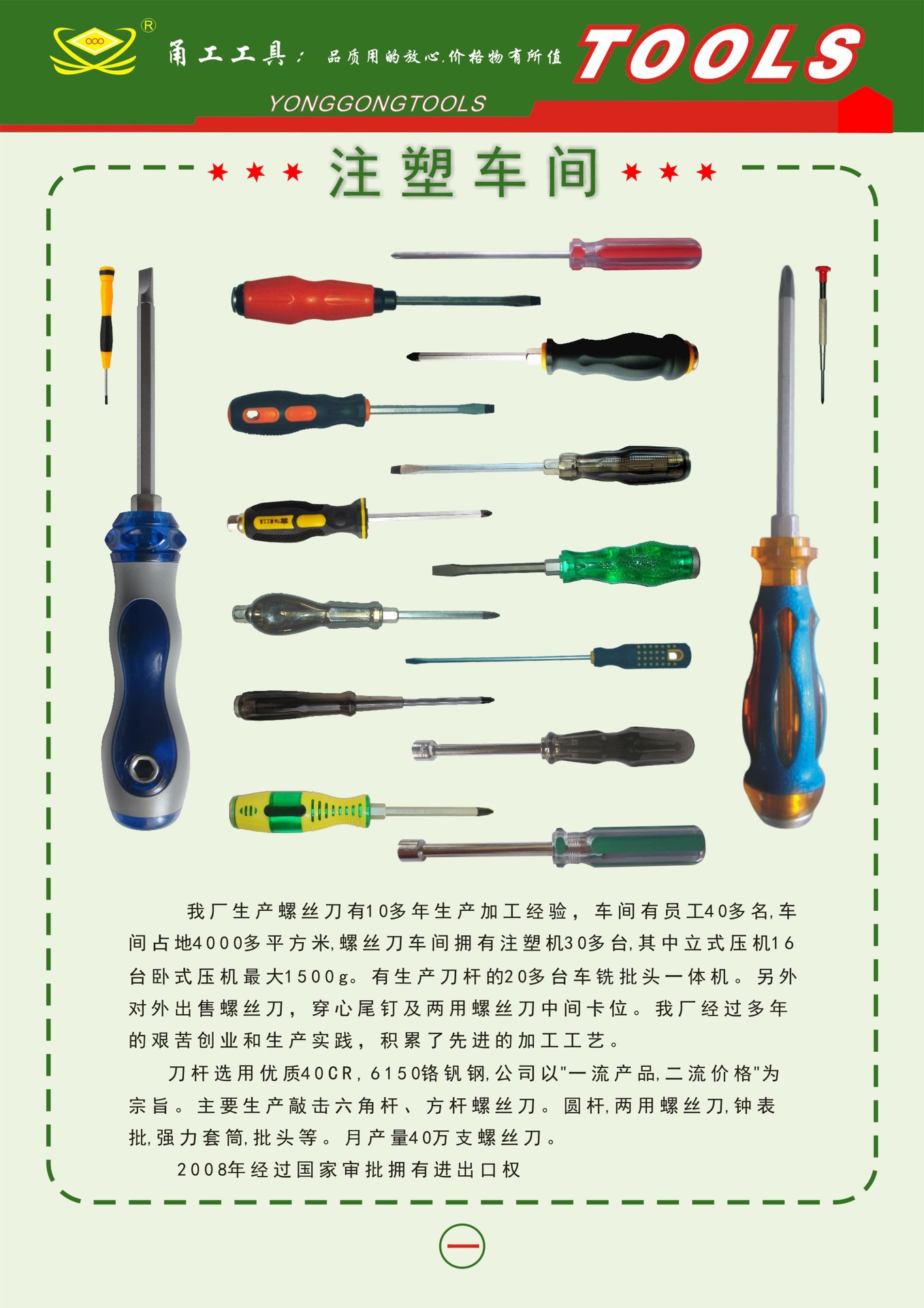 刀杆选用优质40CR 6150 铬钒钢,公司以"一流产品 二流价格"为宗旨. 主要生产敲击六角杆,方杆,圆杆螺丝刀,两用螺丝刀. 钟表批,强力套筒,批头等手工工具. 月产量40万支螺丝刀.