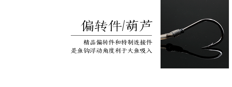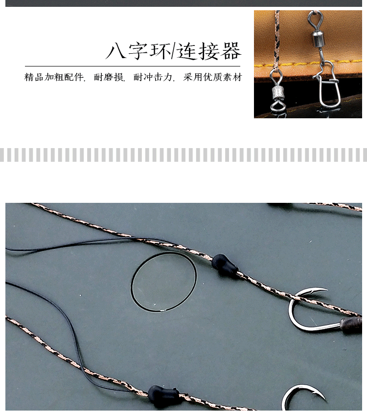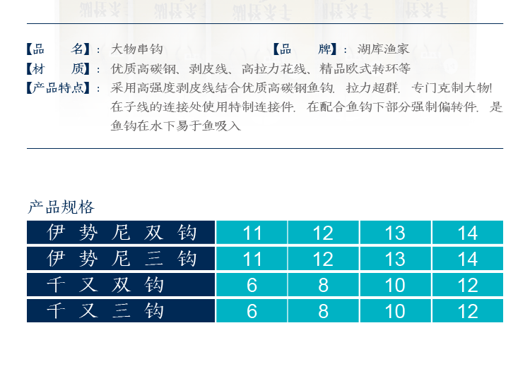 友情提示:湖库巨物串钩鱼钩选用BKK优质出口型伊势尼和千又钩,线材选用欧洲标准塑皮防缠绕编织线,以及多编织隐蔽花线作为主要材料,手工精心制作。我们遵循提倡小钩细线搏大物的理论为基础,因此钓到大鱼时不宜使用暴力进行作合操作,以免伤竿伤线,鱼钩导致鱼钩变形跑鱼。(另:产品我们在湖库中进行过反复测试,淡水大型鱼几十斤测试无问题)