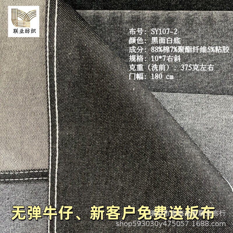 现货黑面白底原布无弹牛仔布料180门幅10*7纱支375克重新客送板布