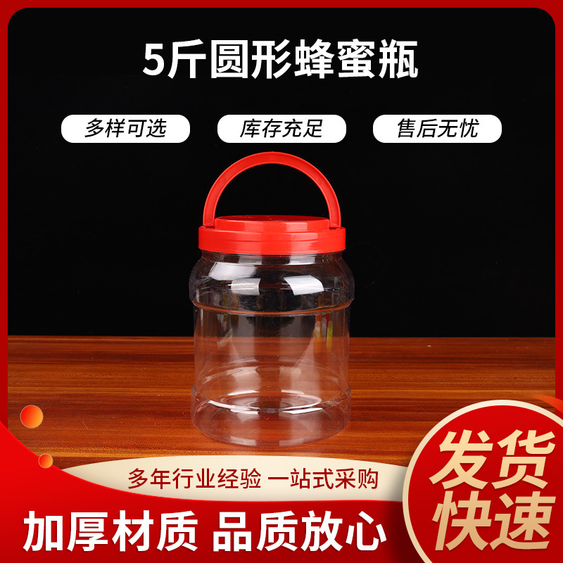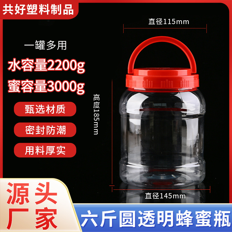 河南远洋蜂业,6斤加厚蜂蜜瓶,纸箱包装,一箱18个,有黄色和红色手提盖,无备注颜色随机发货,蜜容量3000g,水容量约2200g,一个约重100g,高度约18cm,口径约11.5cm,量大优惠,欢迎咨询!