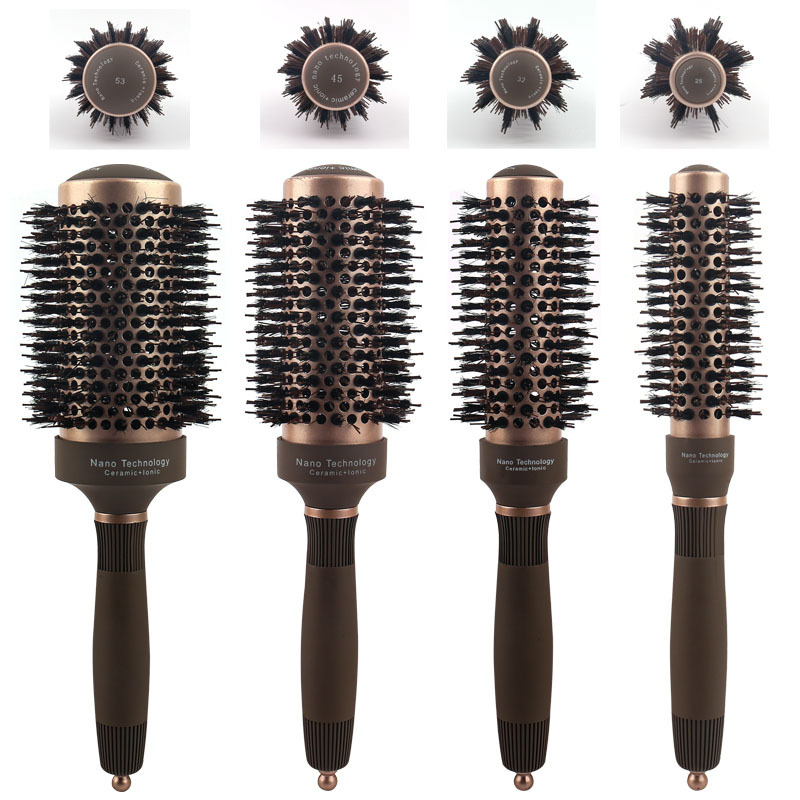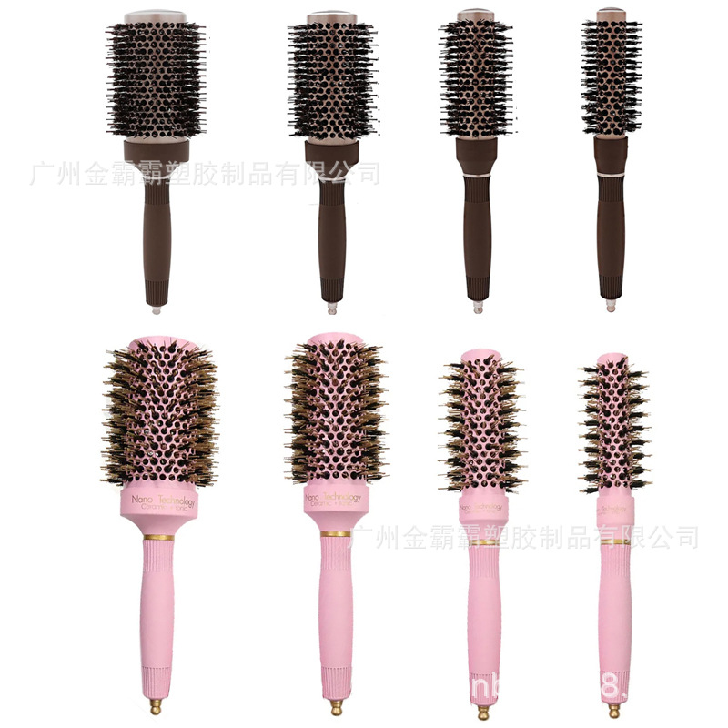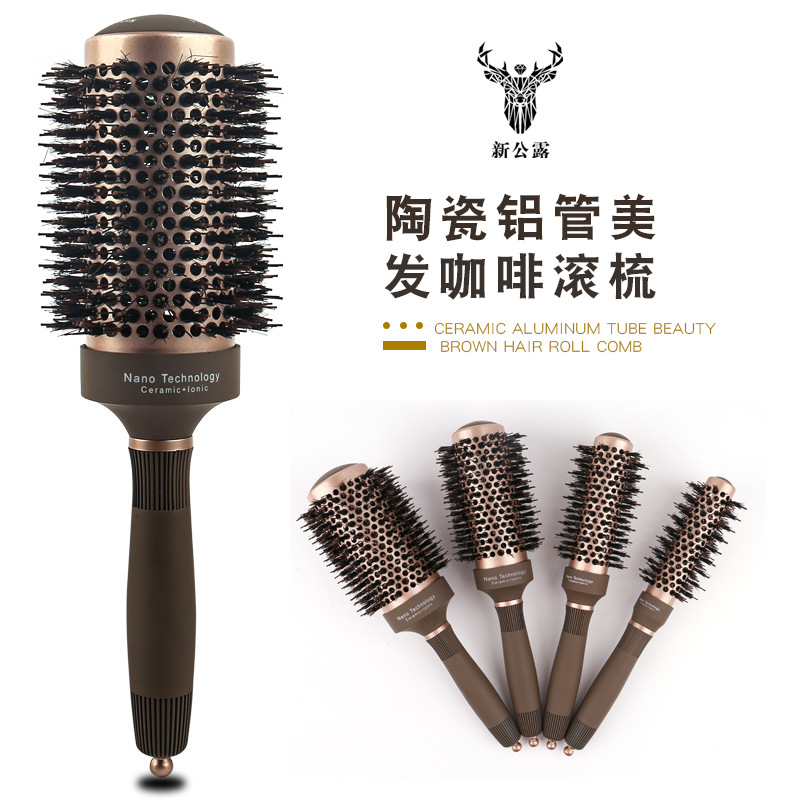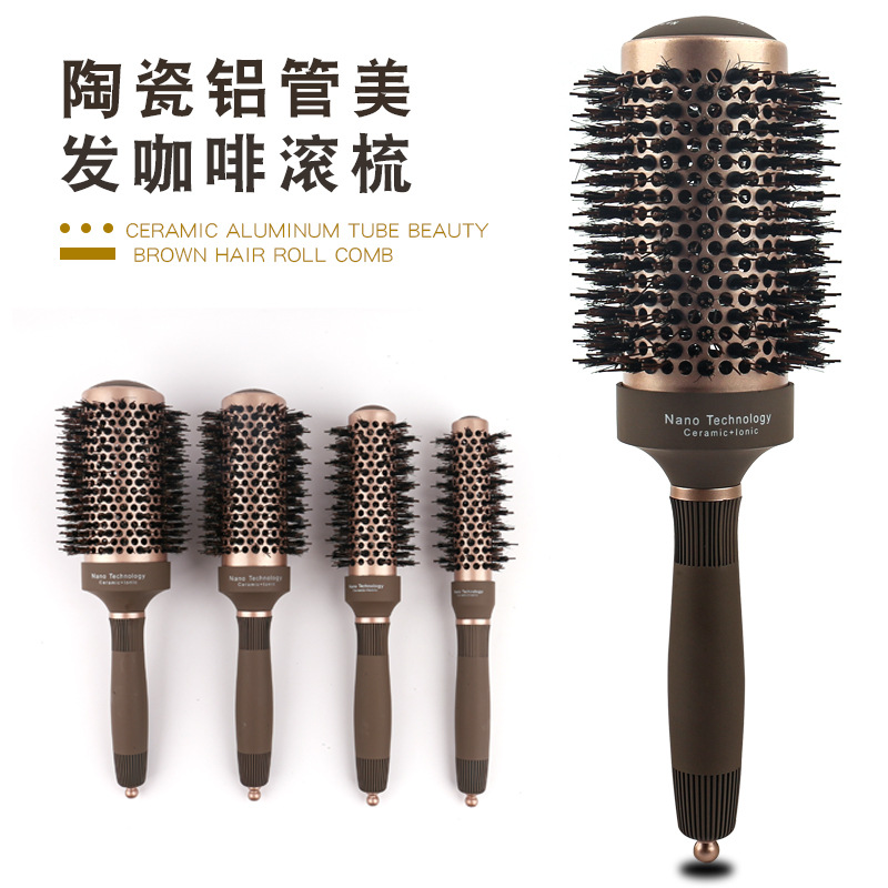 美髪陶磁器アルミニウム管カールスタイル櫛豚毛ナイロンコーヒー色円筒美容櫛卸売りローラーカール