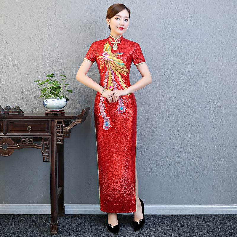 スパンコール付きチャイナドレス 新型 気品漂う エレガントなロングドレス ショーやパフォーマンスに最適 改良版ワンピース