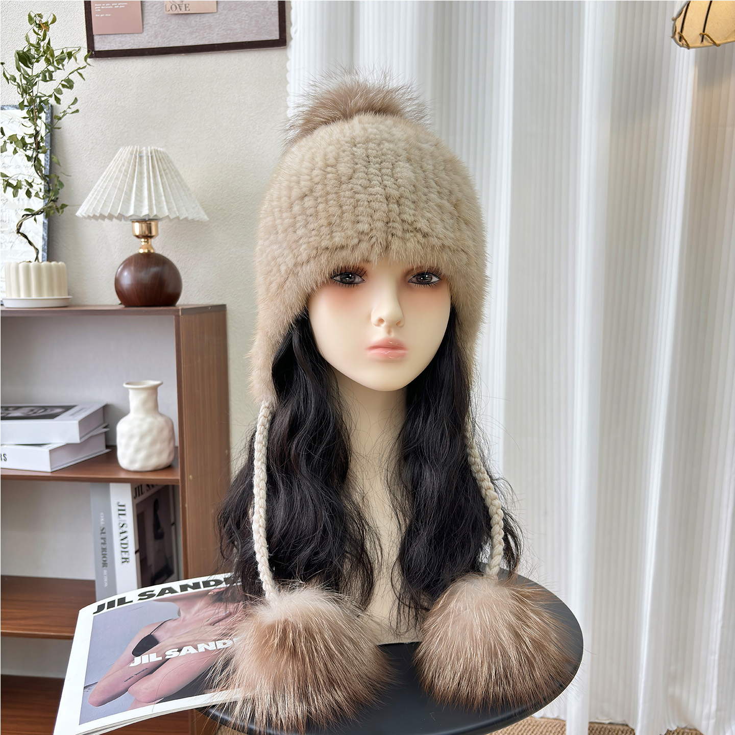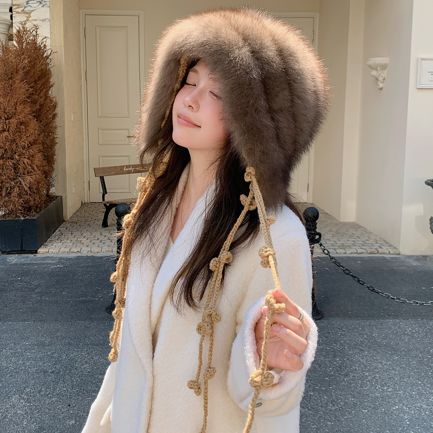 貂皮帽子女冬季水貂毛皮草编织帽子韩版百搭款护耳保暖雷锋帽