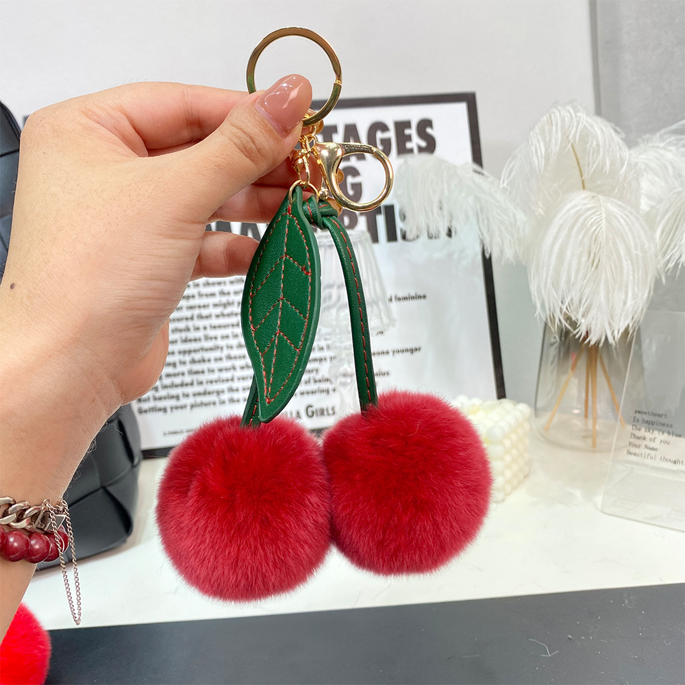 ウサギの毛の赤いさくらんぼの車のキーホルダーのペンダントinsのかわいい毛のボールのカバンのペンダントの誕生日プレゼント