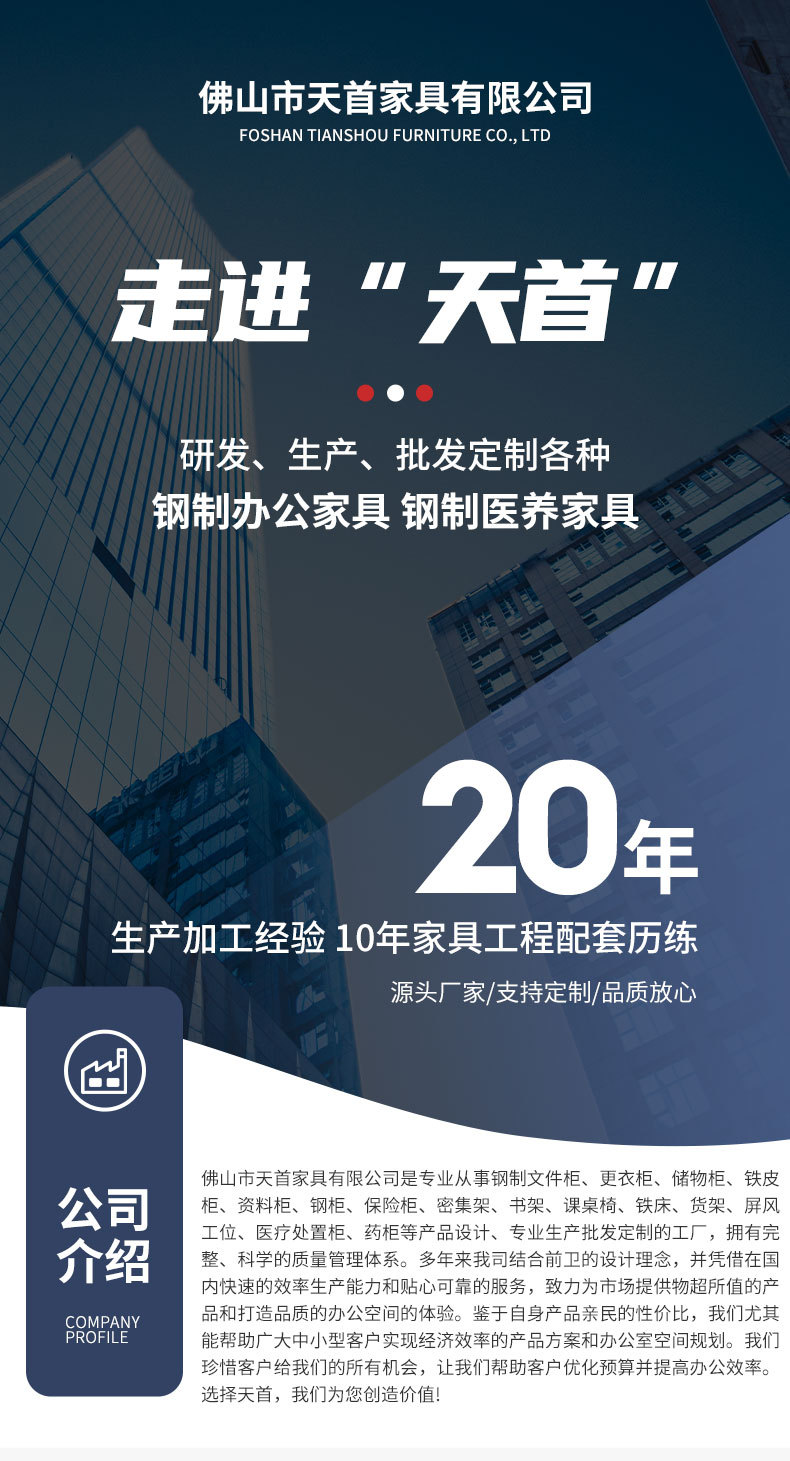 佛山市天首家具有限公司是文件柜、更衣柜、储物柜、铁皮柜、资料柜、钢柜、保险柜、密集架、书架、课桌椅、铁床、货架、屏风等产品专业生产加工的公司,拥有完整、科学的质量管理体系。 多年来我司结合先进的设计理念,并凭借在国内快速高效的生产能力和贴心可靠的服务,致力为市场提供物超所值的产品和打造一流的办公空间的体验。鉴于自身产品卓越的性价比,我们尤其能帮助广大中小型客户实现最经济高效的产品方案和办公室空间规划。同时,在讲求能源可再生化的大环境下,我们始终遵循严格的绿色环保标准,进行产品的设计、生产和实施,生产上尽可能使用可再生材料并最大可能的延长产品使用寿命。 我们期许通过优质的服务以及对设计高效办公空间的专业能力,能够得到广大客户的认可。我们珍惜客户给我们的所有机会,让我们帮助客户优化预算并提高办公效率。选择天首,我们期待和您一起成长!