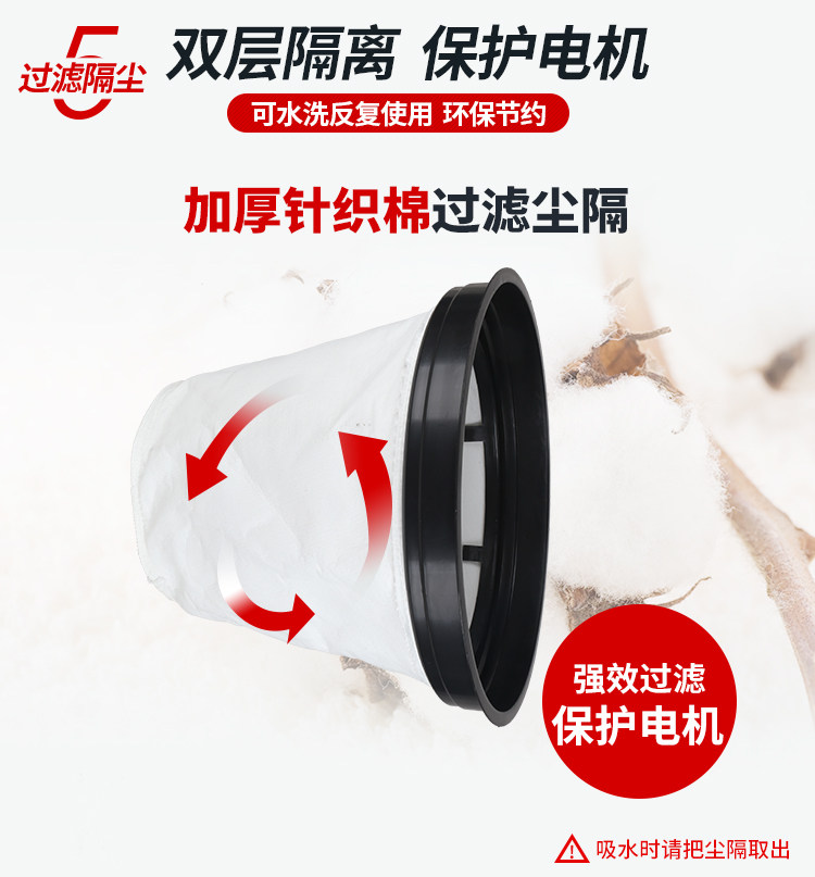 7.长期使用吸尘吸水机时,会因过滤网网眼的堵塞而致使吸力下降。为了防止吸力下降,应定期用水清洗过滤网以及布袋,洗后在阴凉处晾干再使用,即可恢复吸力.