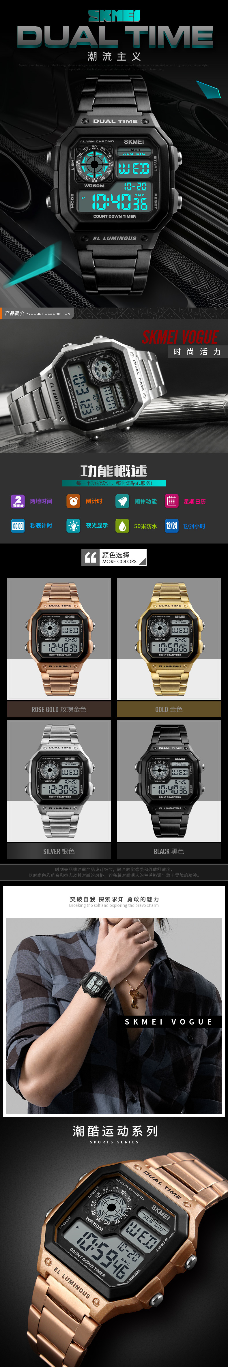 美ファッション双盤指針電子腕時計クロスボーダー対外貿易ブロック金時計多機能運動防水腕時計
