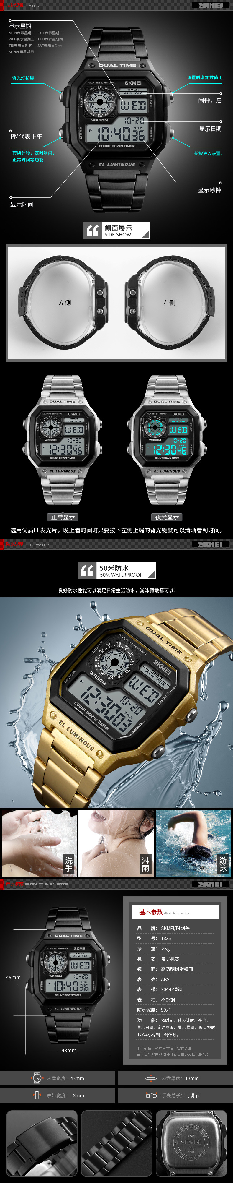 美2213ファッション男性創意双芯多顕電子時計多機能男子学生防水夜光時計