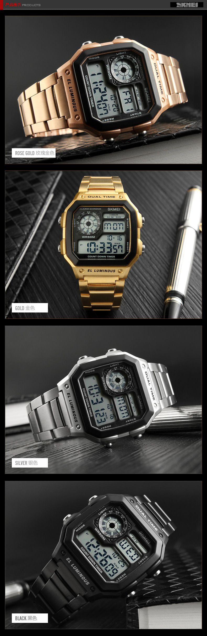 SKMEI モーメンツ美しいファッション外国貿易防水男性と女性の電子時計学生屋外発光スクエアカップル腕時計