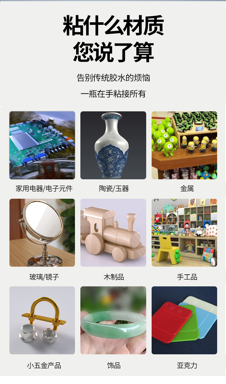 使用範囲 主に家具の修理、広告物、包装カートン、プラスチック玩具、鉢植えの造園、手工芸品、靴の材料の接着に使用されます。