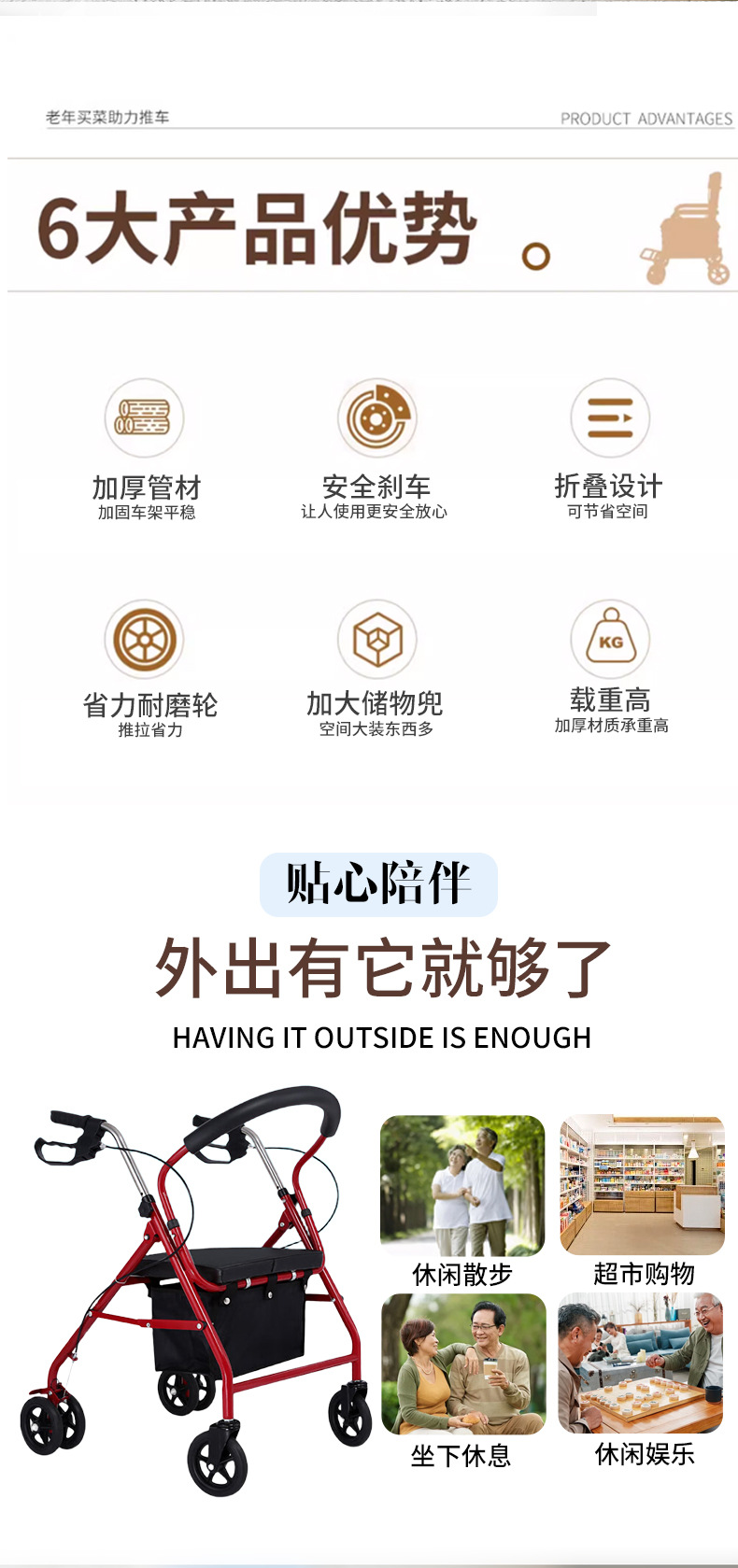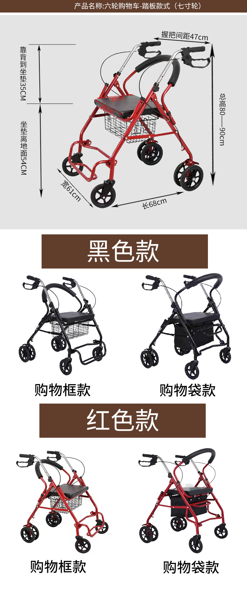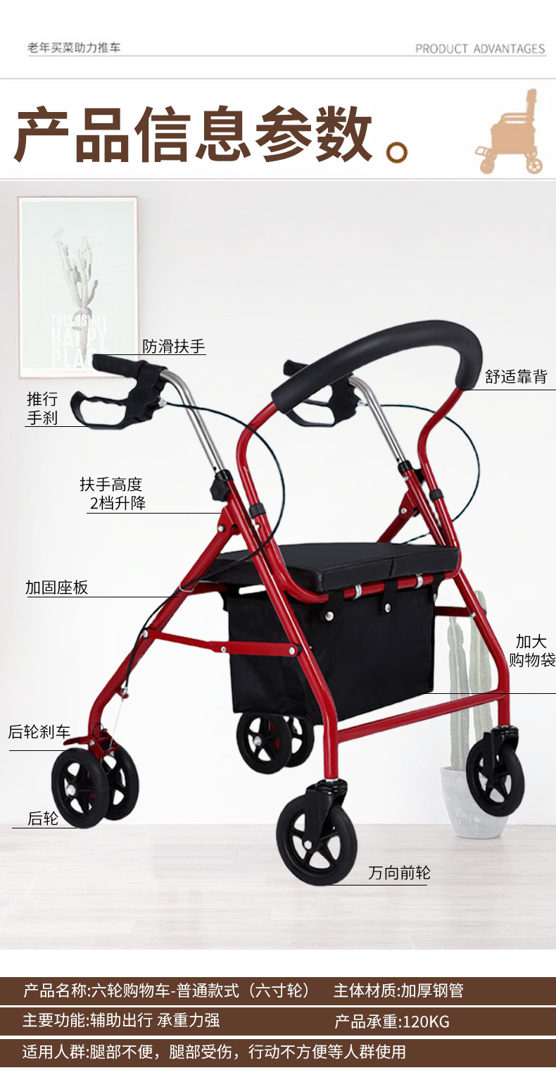 四轮买菜车老人助行器手推车可推可坐购物车老年休闲带座椅助行器