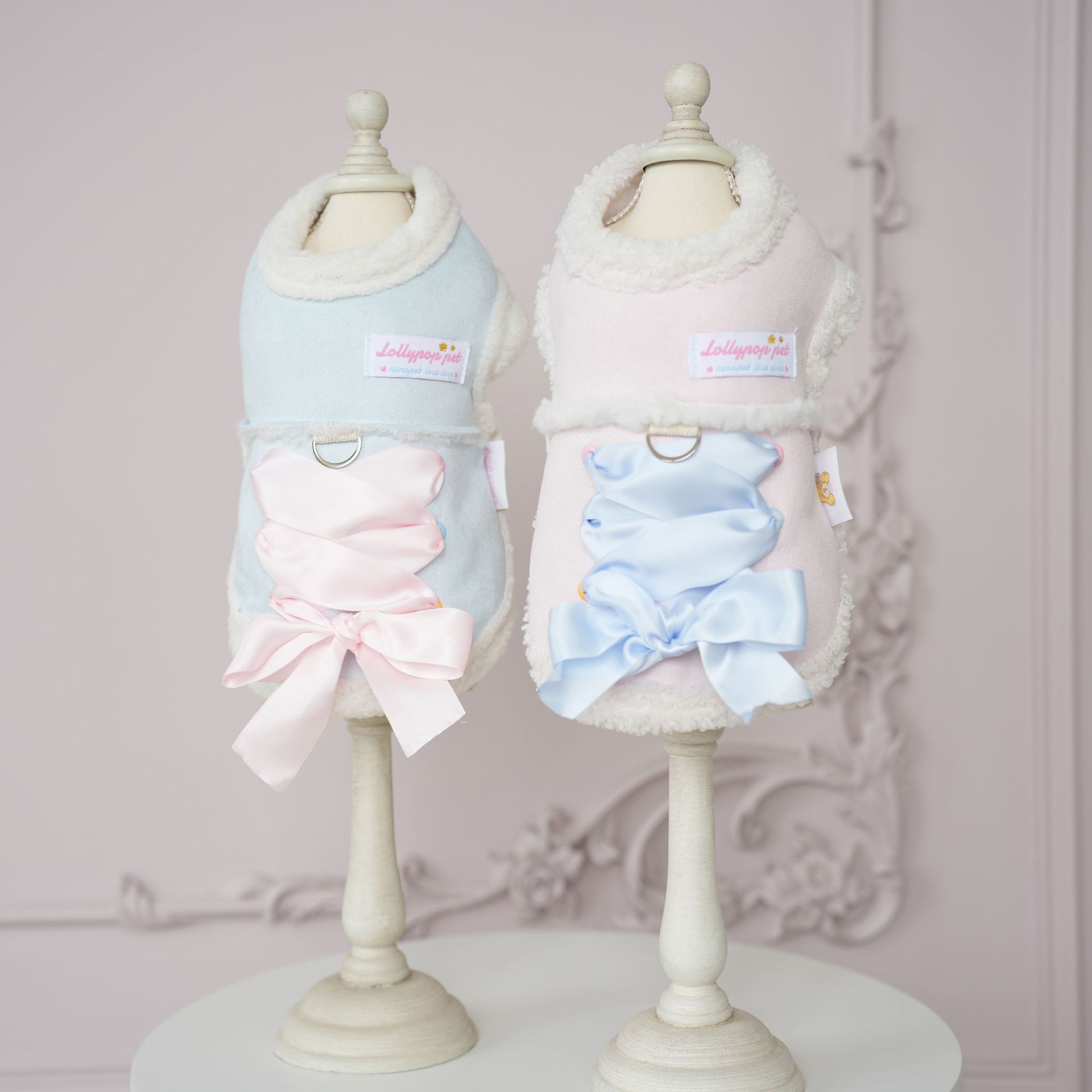 ロリポップのペット服秋冬の新型のひもの一体の綿の服の犬の服の猫のピンクの青い両足の服は牽引することができます。