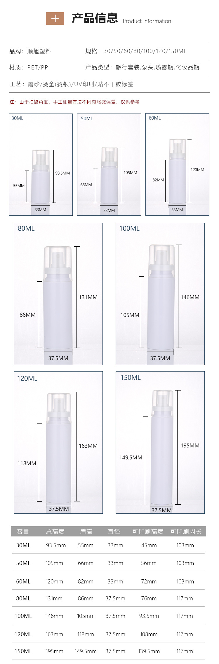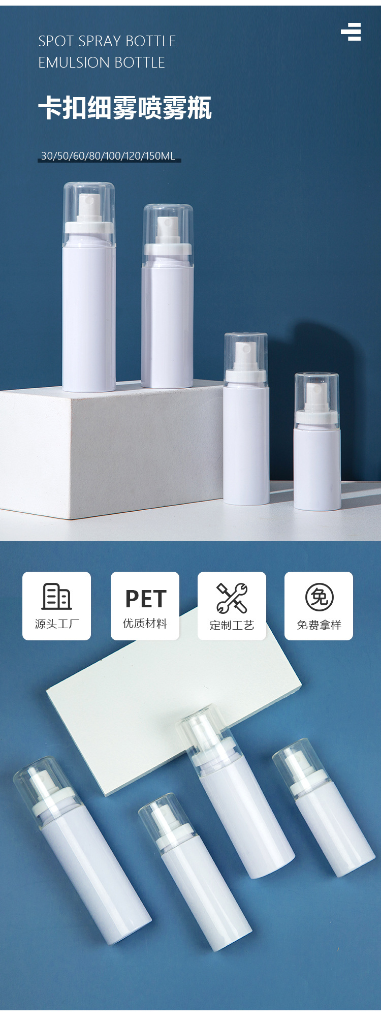 メーカー直供50ml-150PET白色透明白色バヨネットスプレー化粧水日焼け止めスプレーボトル現物