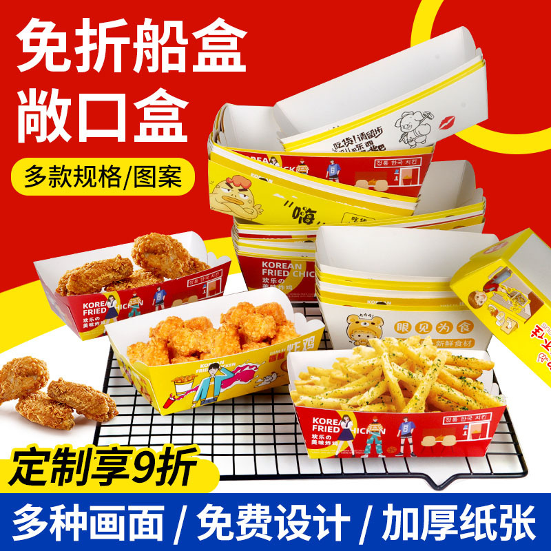 カスタマイズされた厚みのある使い捨てオープンボート型スナック包装箱チキンステーキフライドポテトチキンポップコーンフライドチキン紙箱送料無料
