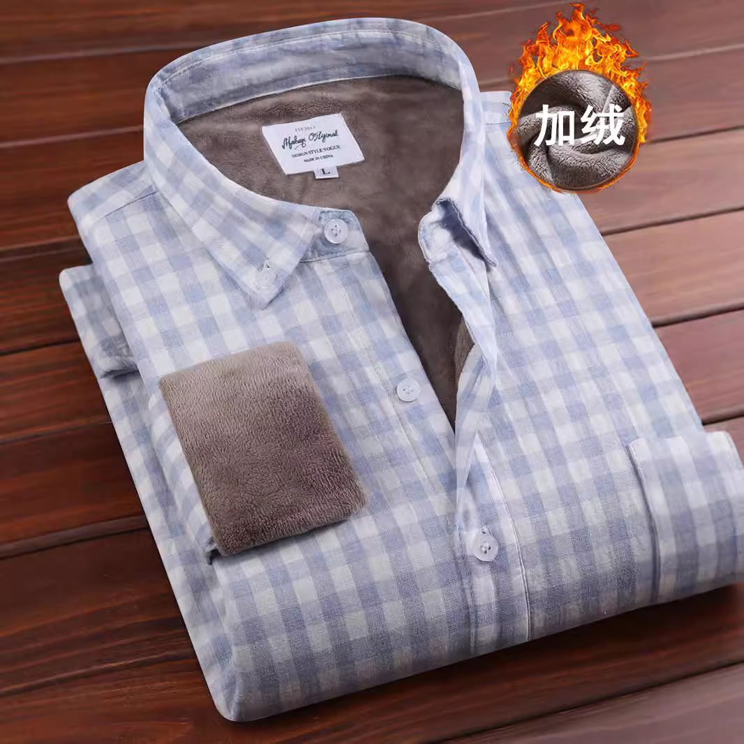 秋冬紳士服純色磨毛青黒格子加毛保温長袖シャツ襟カジュアルフランネル男シャツ