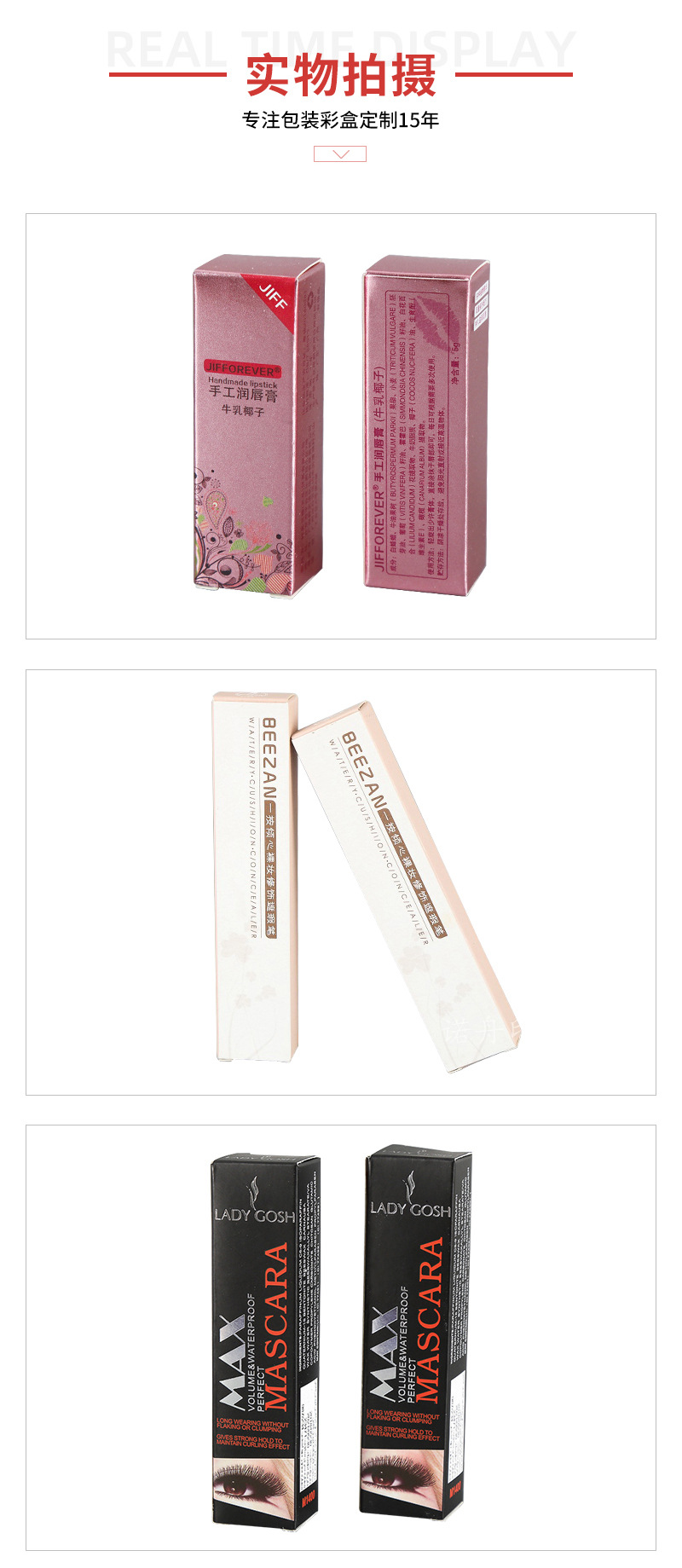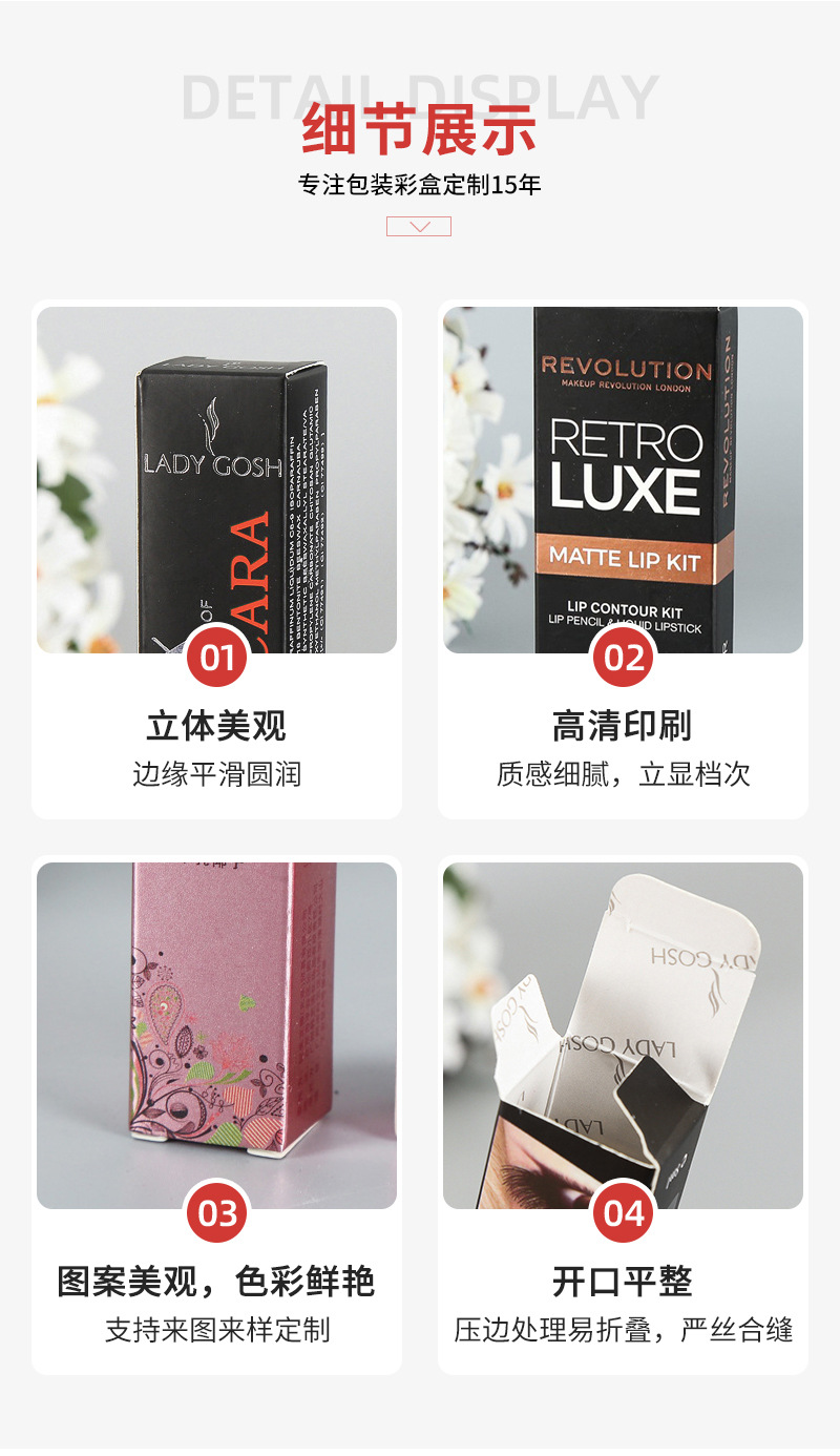 眉毛ペンシル、アイライナー、マスカラ、カラーボックス、口紅、リップクリーム、印刷可能なロゴ入り包装紙箱を製造するメーカー