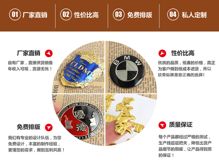 苍南欣荣工艺标牌厂是一家集设计、生产、研究、检测于一体的现代化标牌生产企业。主要经营CD纹标牌、冲压铝牌、金属标牌、反光牌、车标、钥匙扣、水晶滴塑等产品。产品远销欧、美、澳洲、东南亚等全球各地。广泛应用到各个行业。公司坚持"优质、创新、诚信”为产品生产宗旨,注重引进国内外生产技术及设备和技术娴熟的员工,确保产品和服务质量,能极大的满足广大客户对包装产品的各种需求。